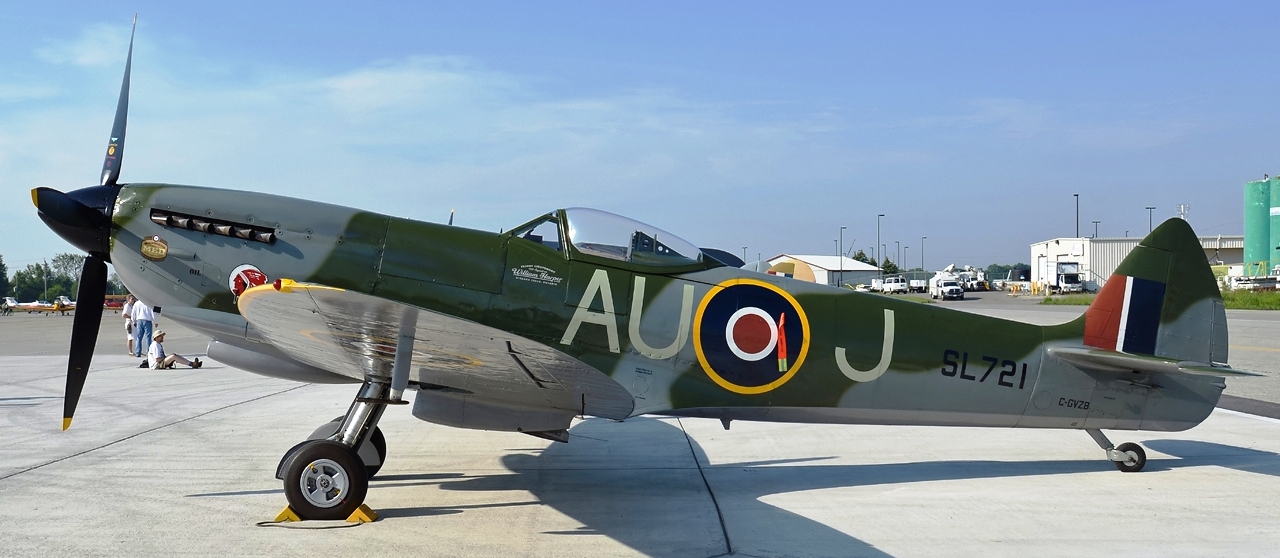 Supermarine Spitfire LF Mk. XVIe (Serial No. SL721), Reg. No. C-GVZB, 421 Squadron, N9721WK.  Owned by Michael Potter.  Refinished in the markings of AU-J from No. 421 Squadron RCAF.  Vintage Wings of Canada, Gatineau, Quebec.