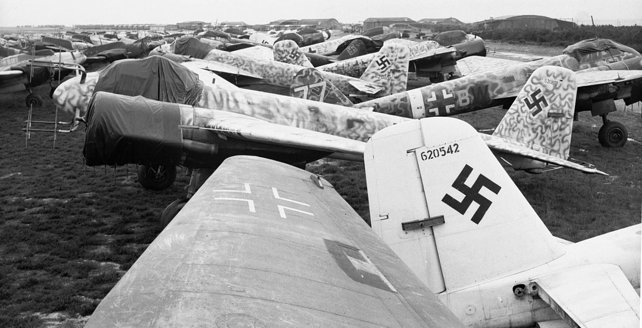 Junkers Ju 88 night fighters awaiting scrapping at Grove airfield in Denmark, 2 August 1945.