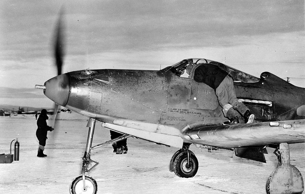 Bell P-39L-1-BE Airacobra, USAAF (SerialNo. 42-4673?) at Nome, Alaska, in 1943-44. The red Soviet stars under the wings identify this as a lend-lease aircraft ferried to the USSR via Alaska.