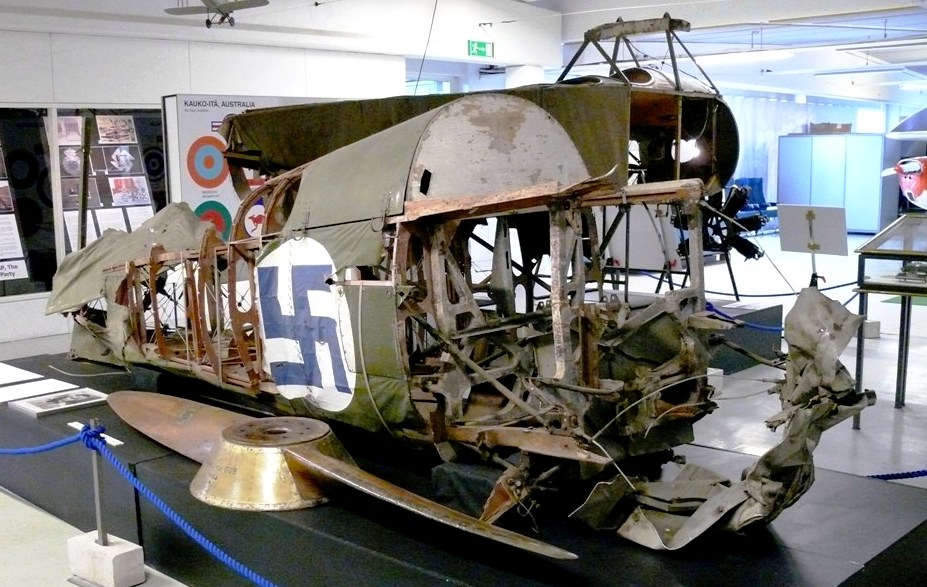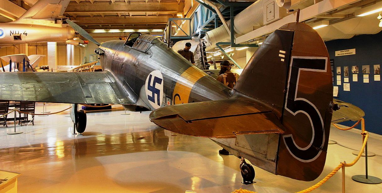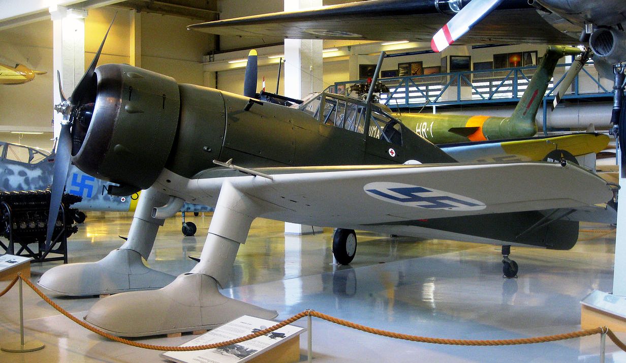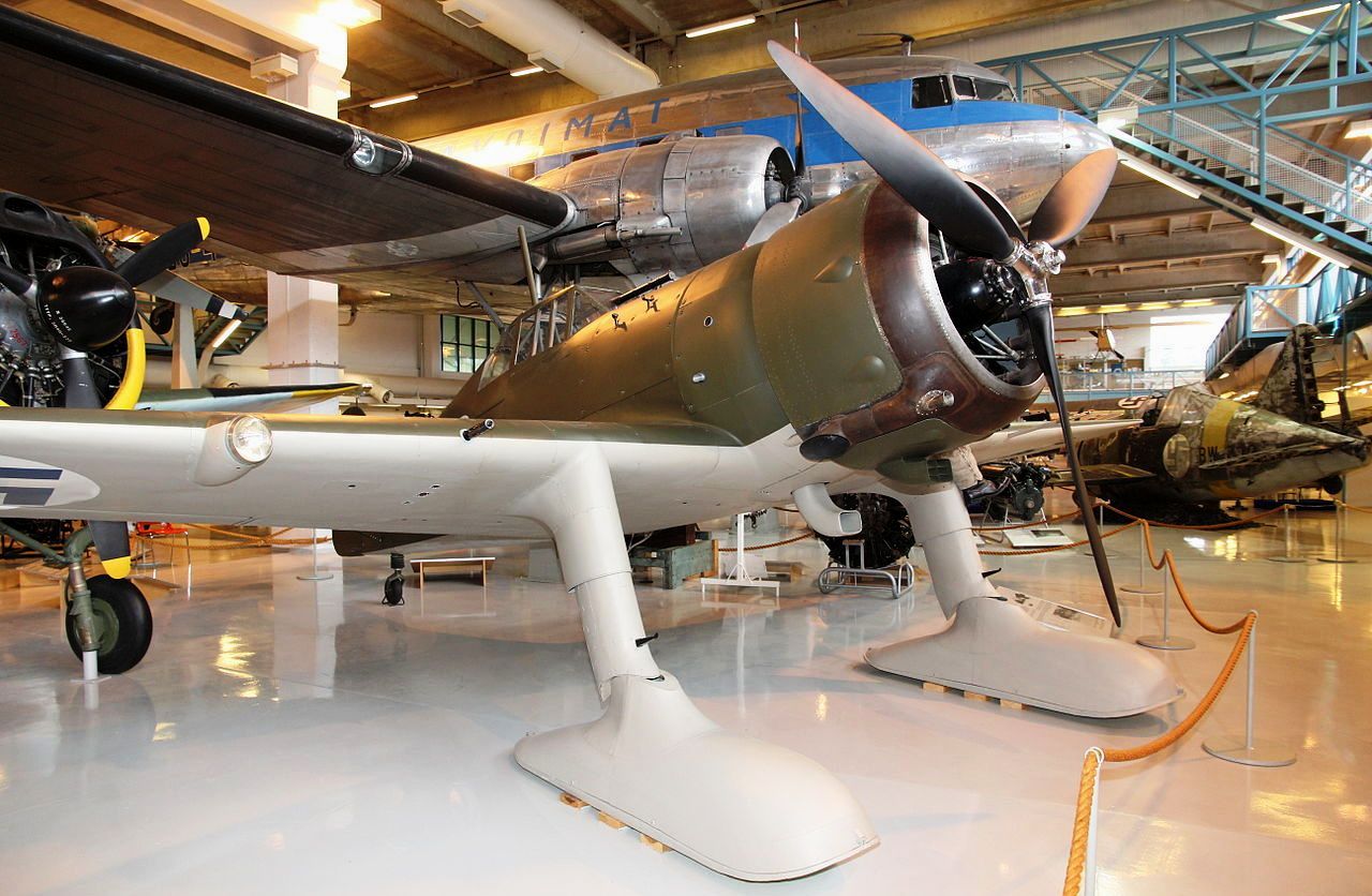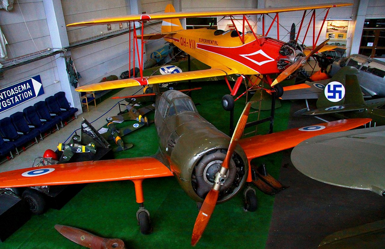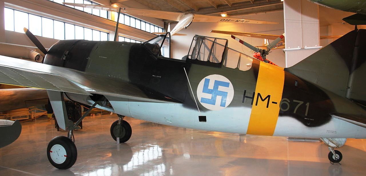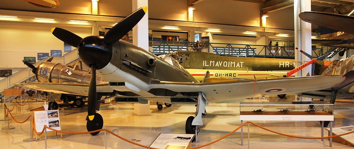VL Humu (Serial No. HM-671). The Humu is a Finnish fighter designed by Valtion lentokonetehdas, based on the American Brewster F2A Bufflo. The Humu was largely constructed out of wood, due to scarcity of metals, but the frame was made from steel and its design followed closely that of the Brewster. Because of the small numbers of Brewsters in service (44) in the Finnish Air Force, the Finns wanted to see if they could design a fighter based on the Brewster design. The aircraft designers Torsti Verkkola, Arvo Ylinen and Martti Vainio were called upon to lead the project. The Finnish Air Force ordered 90 Humus; however, production was stopped in 1944, when only one aircraft had been produced (Serial No. HM-671. The first flight took place on 8 August 1944, HM-671 flying for a total of 19 hours and 50 minutes. The aircraft was 250 kg (551 lb) heavier than calculated, its engine was underpowered, and the aircraft was simply not of the standard expected from a fighter aircraft of 1944. It was noted, however, that the change from wing guns to fuselage mounted machine guns was worthwhile. The sole survivor has been preserved in the Central Finland Aviation Museum, Tikkakoski.