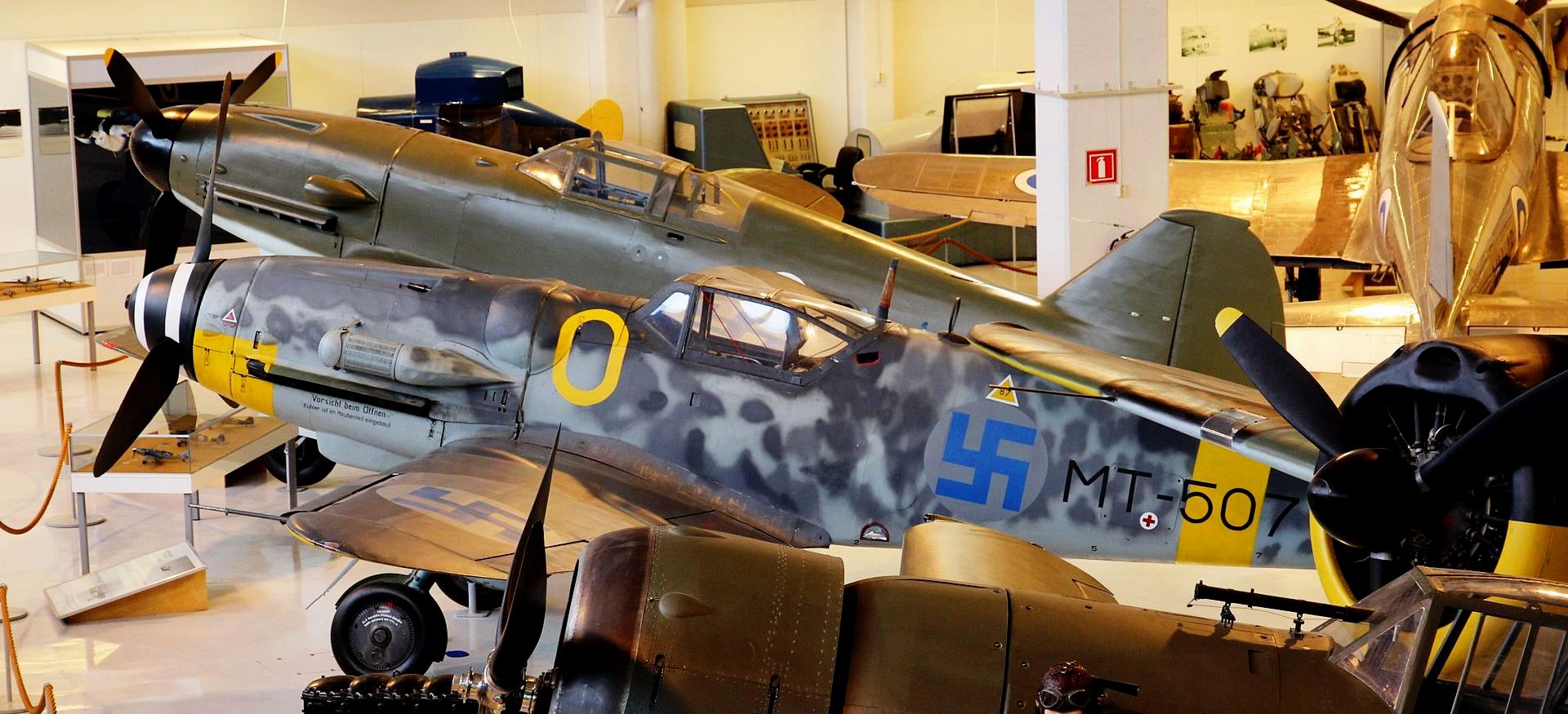 Keski-Suomen Ilmailumuseo, Aviation Museum of Central Finland, 41160 Tikkakoski. (BW-372 Brewster Buffalo, Messerschmitt Bf 109G-6Y (MT-507/O)).