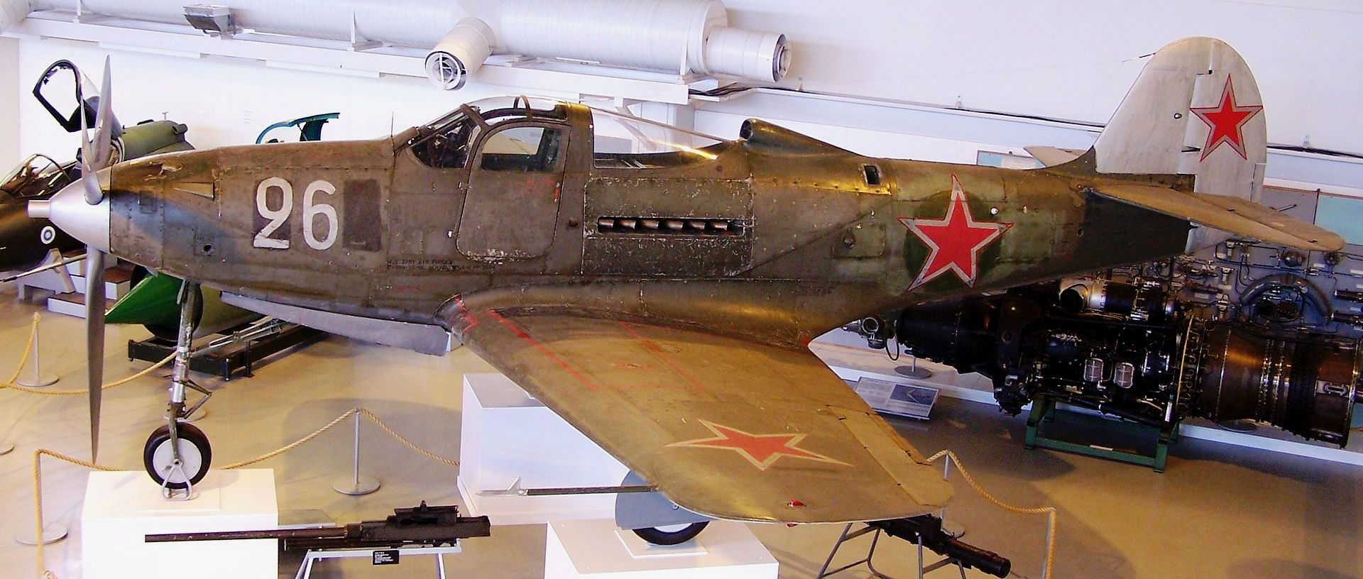 Bell P-39Q Airacobra (Serial No.). “White 26“. This aircraft was originally a Soviet lend-lease fighter, shot down and captured by Finnish troops during the Second World War. It was one of 3,291 delivered to the Soviet Union during the war. The Finns captured three in fairly intact condition. It has been restored in the original wartime camouflage and markings, using the wings of the 44-3255 that landed in Inkeroinen on June 17th 1944, the fuselage of the 44-2664 found in Aunus and the fin and the rudder from aircraft on the Norwegian fells.