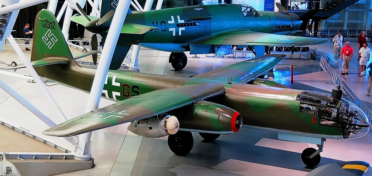 Arado Ar 234B-2 Blitz (Lightning), (Wk. Nr. 140312), coded F1+GS, USA 50, 505, Reg. No. 27, restored coded as F1+GS. This aircraft was one of nine Ar 234s surrendered to British forces at Sola Airfield near Stavanger, Norway. The aircraft had been operating with 9. Staffel III./Kampfgeschwader 76 (later reorganised as Einsatzstaffel) during the final weeks of the war, having operated previously with the 8th squadron, carrying the full-four-character Geschwaderkennungmilitary code of “F1+GS” on the fuselage sides, with the wing code of “F1” painted on in a much reduced size for “low-visibility” requirements. This aircraft and three others were collected by the “Watson’s Whizzers” of the USAAF to be shipped back to the United States for flight testing. The aircraft was flown from Sola to Cherbourg on 24 June 1945 where it joined 34 other advanced German aircraft shipped back to the U.S. aboard the British aircraft carrier HMS Reaper, arriving at Newark, New Jersey on 28 July. Upon arrival two of the Ar 234s were reassembled (including 140312) and flown by USAAF pilots to Freeman Field, Indiana for testing and evaluation. This aircraft was assigned the foreign equipment number FE-1010, later T2-1010. After receiving new engines, radio and oxygen equipment, 140312 was transferred to Wright Field near Dayton, Ohio and delivered to the Accelerated Service Test Maintenance Squadron (ASTMS) of the Flight Test Division in July 1946. Flight testing was completed on 16 October 1946 though the aircraft remained at Wright Field until 1947. It was then stored until transferred to the Smithsonian Institution. Restoration was completed in 1989. This aircraft is preserved in the National Air and Space Museum (NASM), Steven F. Udvar-Hazy Center, Washington Dulles International Airport, Chantilly, Virginia.