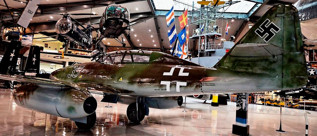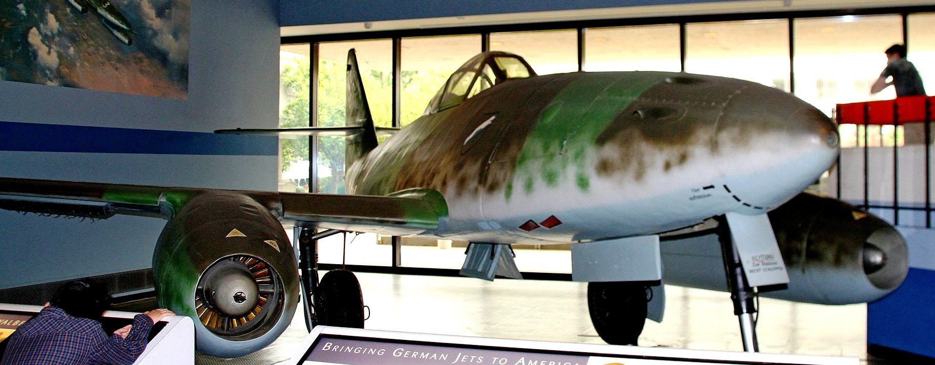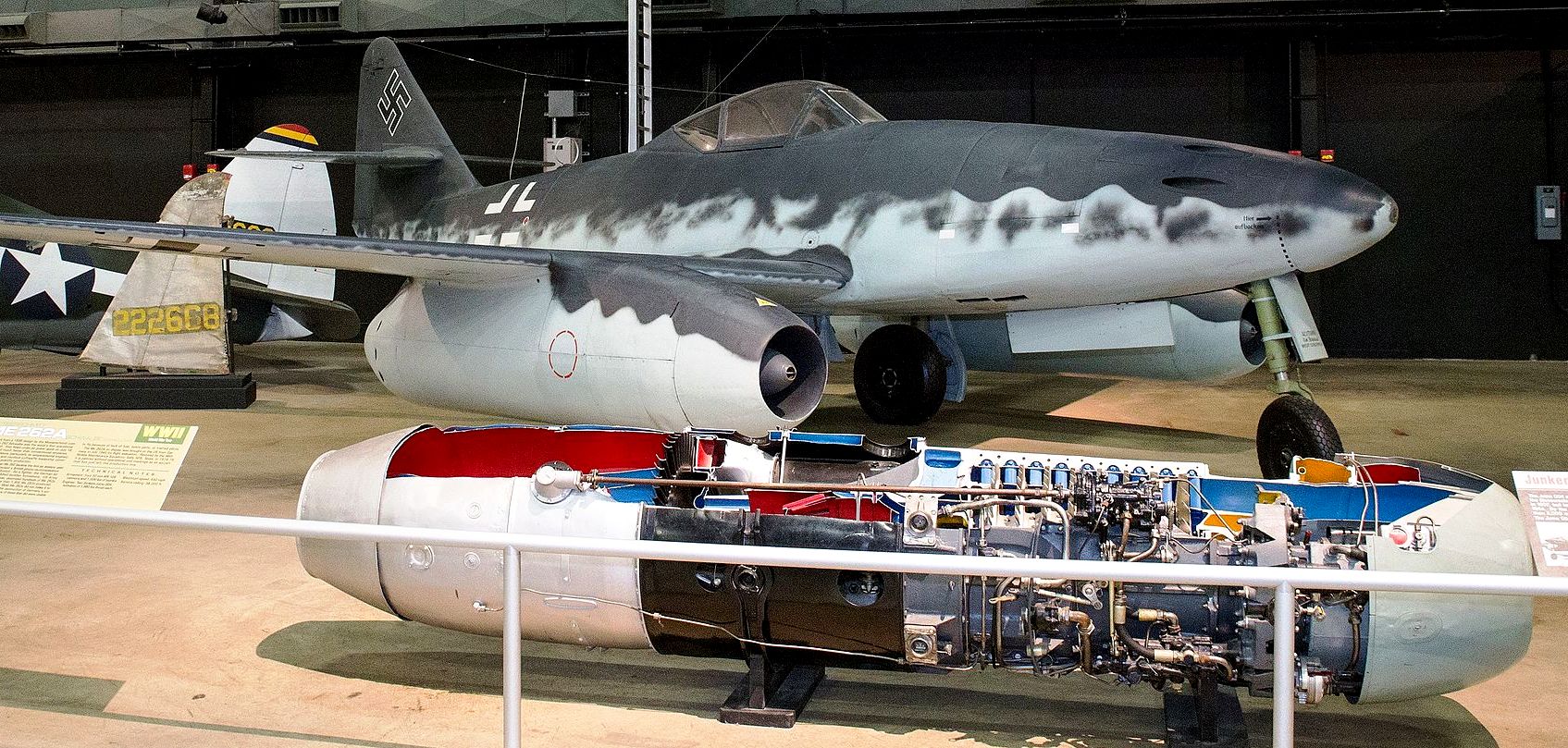 Messerschmitt Me 262A-1a Schwalbe (Wk. Nr. 501232), 5, c/n 501232, ” Yellow 5″, 3./KG(J)6, and its Junkers Jumo 004 turbojet engine. National Museum of the United States Air Force, Dayton, Ohio.