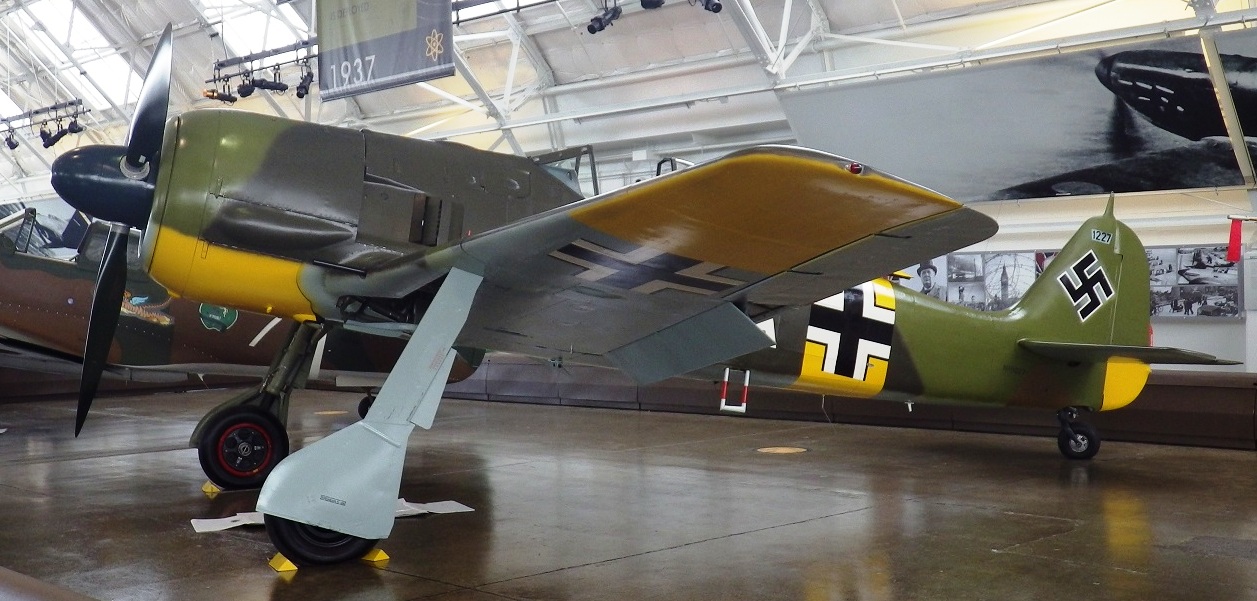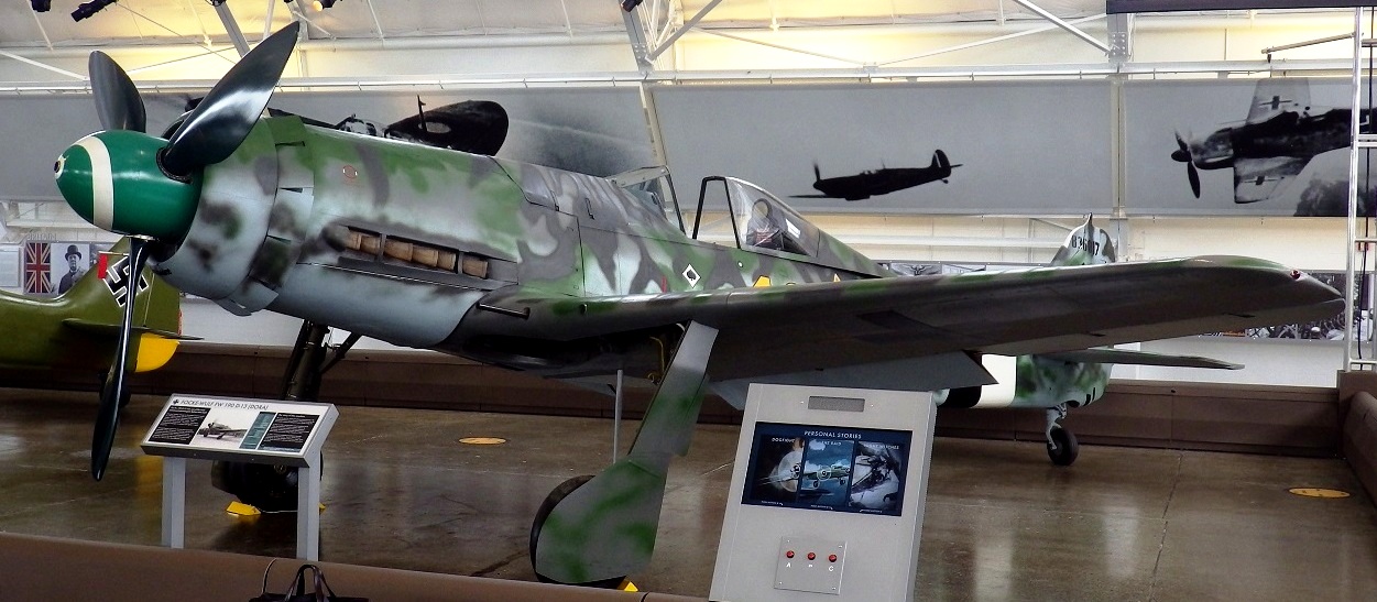 Focke-Wulf Fw 190 D-9 (Wk. Nr. 601088), coded <1+~ , “Black 8”. This airframe is from IV (Sturm)./JG 3 “Udet” Geschwader, and was captured by the RAF intact. Initially designated USA 12 or USA 15, it became No. 24, then after it came to the USA it was assigned the foreign equipment number FE-120 and later T2-120. It is on long term loan from the National Air and Space Museum, at the National Museum of the United States Air Force, Wright-Patterson AFB, Dayton, Ohio.