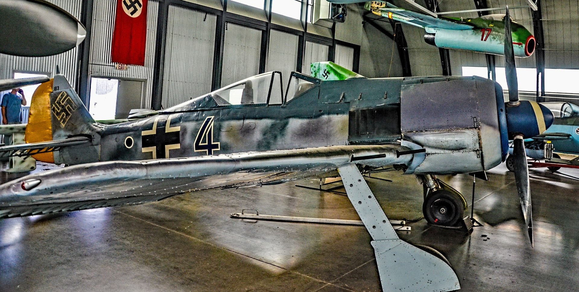 Focke-Wulf Fw 190 A-5/U3 (Wk. Nr. 151227), “White A“, coded DG+HO, 4./JG54. This aircraft was flown by Paul Rätz of JG 54 when it crash landed in a forest in Voibakala near Saint Petersburg on 9 July 1943 due to sabotage of the oil lines. It was discovered in the same location in 1988 or 1989 and was recovered in 1990 or 1991. Reg. No. N19027. It is currently the only airworthy Fw 190 with an original BMW 801 engine.