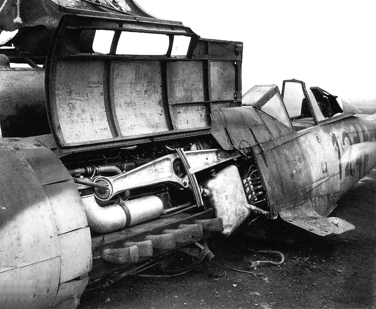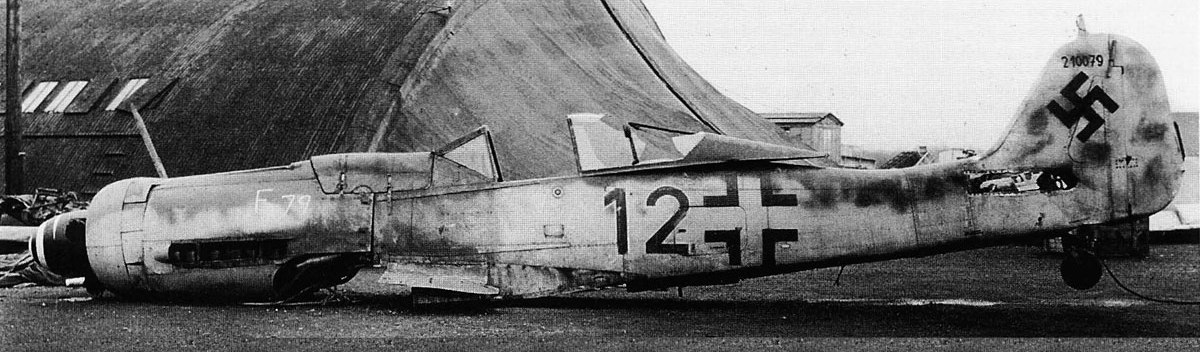 Focke-Wulf Fw 190D-9, (Wk. Nr. 210079), 12+, “Black 12”, flown by Leutnant Theo Nibel in the 10. / JG 54, and lost due to a bird strike on the morning of 1 Jan 1945 during Operation Bodenplatte.  Remains shown here at Farnborough, England, late 1945. Painted in two shades of light grey with pale blue under surfaces.