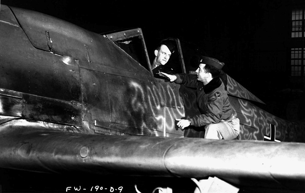 Focke-Wulf Fw 190D-9, (Wk. Nr. 401392), “Black 5”, JG26, captured at Flensburg.  Designated RAF USA 13, this aircraft was shipped to the USA on HMS Reaper and allotted USA FE-121, later T2-121.  In the first photo taken at Newark, the number 31 is visible just forward  and above the horizontal stabilizer referring to its loading position on HMS Reaper.  The third photo shows Ken Chilstrom Wright Field test pilot, sitting in the cockpit with Bob Baird standing near the wing.  This aircraft was scrapped at Freeman Field, Indiana, ca. 1946.