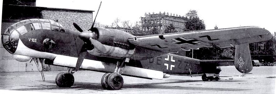 Ju 288 V1 prototype with twin BMW 801 engines. Is it being held in flying attitude by a support under the tail. The actuator rods for the landing gear’s oleo struts are visible behind the main struts.