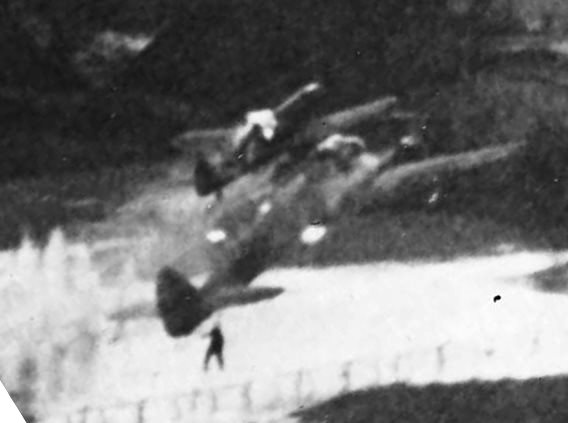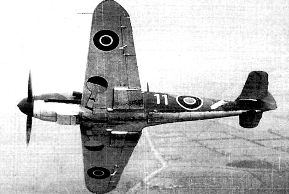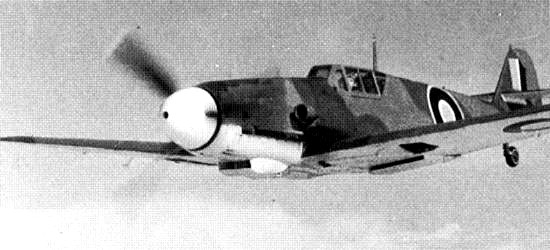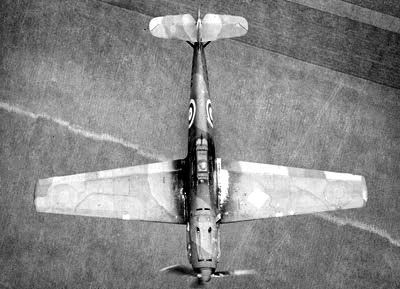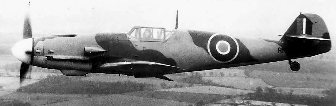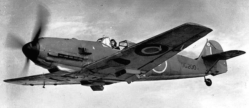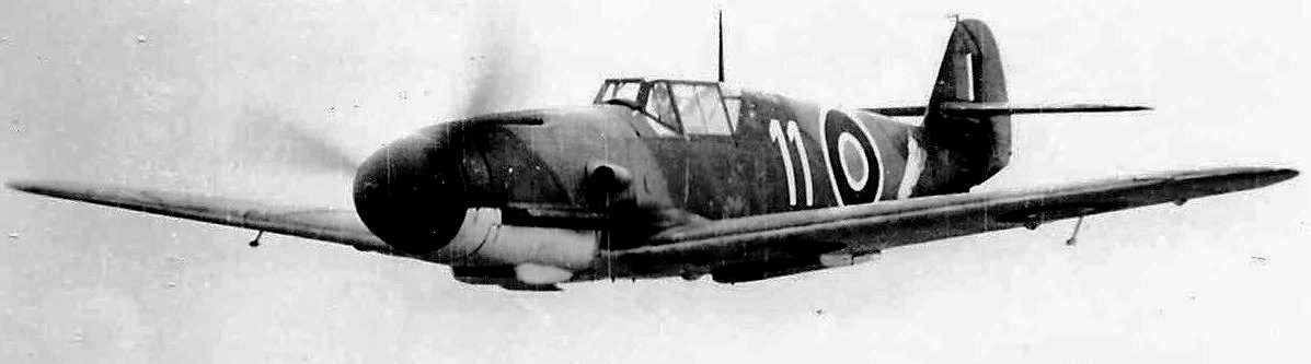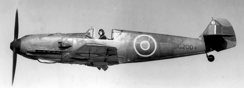 Messerschmitt Bf 109E-3, (Wk. Nr. 4101), coded “Black 12” from I./JG51, RAF DG200, in flight while serving with No. 1426 (Enemy Aircraft) Flight. This aircraft force-landed at Manston, Kent, on 27 November 1940, after being attacked by Supermarine Spitfires of No. 66 Squadron RAF over the Thames estuary. After repair at the Royal Aircraft Establishment it was delivered to Rolls-Royce Ltd at Hucknall in February 1941 for engine performance tests. On 8 February 1942 it was passed to the Controller of Research and Development at Hatfield for propeller tests before going on to the Aircraft and Armament Experimental Establishment at Boscombe Down, and, in March 1942, to No. 1426 Flight at Duxford and later Collyweston. In 1943, DG200 was put into storage, eventually moving to St Athan in 1969 for refurbishment. Once restored to its wartime paint scheme, it moved to the Royal Air Force Museum, Hendon in 1976, where it is presently on display in the Battle of Britain Hall. DG200 is seen here being flown without its cockpit canopy, which was removed (and never replaced) while the aircraft was at Hucknall to enable Wing Commander J.H. Heyworth, a Rolls Royce test pilot who was very tall, to fit into the cockpit. This aircraft is now on display in the RAF Museum, Hendon.