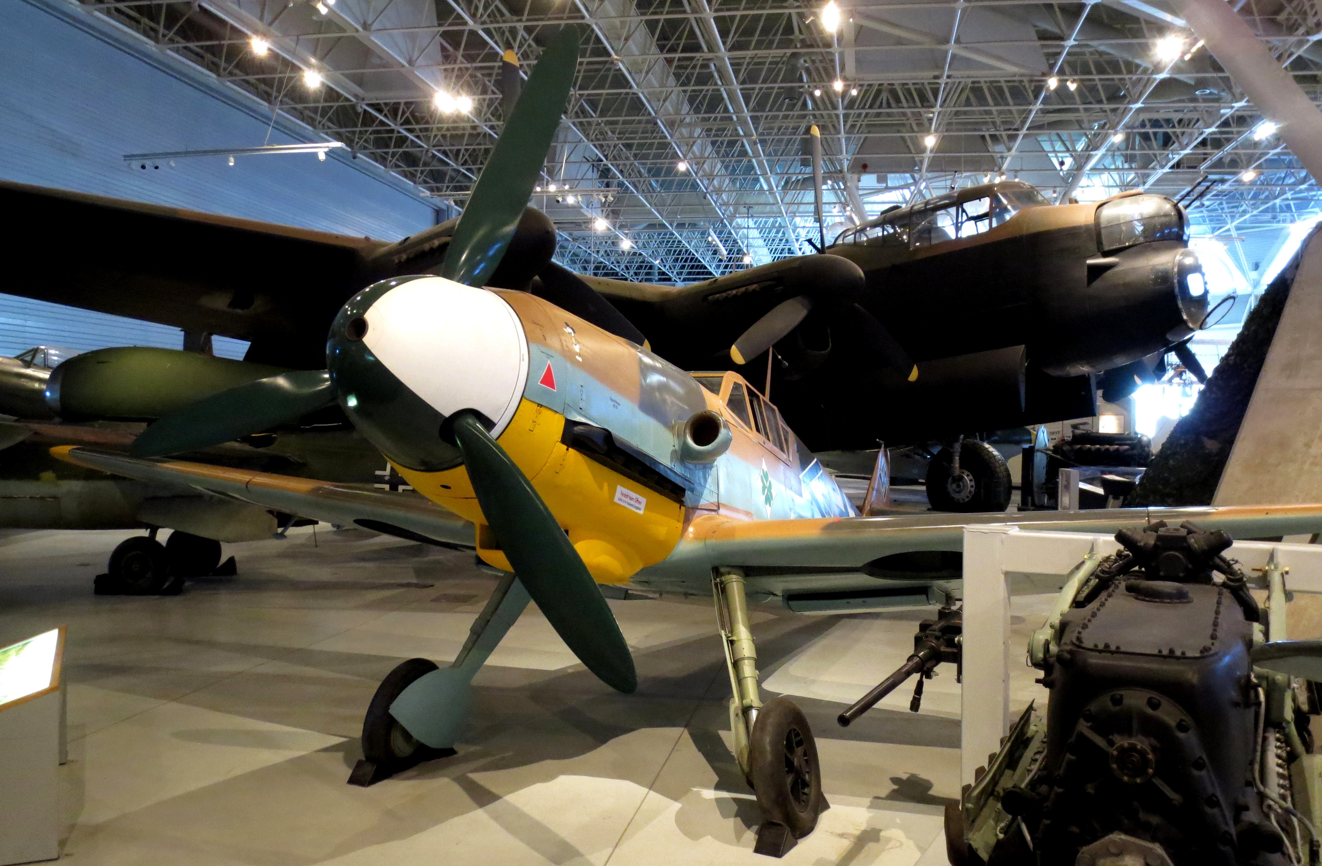 Messerschmitt Bf 109F-4/Z, (Wk. Nr. 10132), coded “CD+LZ“, 2./JG 5, Stab II./JG 54, is on display in the Canada Air and Space Museum, Ottawa, Ontario. This aircraft incorporates parts of (Wk. Nr. 26129). (Wk. Nr. 10132) was allocated to JG 5 in May/June 1942, where it was assigned to Hauptmann Horst Carganico, an air ace with 15 victories serving with 6. /JG 5. On 8 August 1942, his aircraft was hit in the fuselage, wings and the oil cooler by gunfire during an air battle above the Arctic port of Murmansk in the former Soviet Union, causing him to make an emergency landing on enemy territory. Carganico was rescued by a crew flying a Fieseler Fi 156 Storch. The Soviets recovered (Wk. Nr.10132), and sent it to the “Museum of the North” in Severomorsk. In 1995, the Russians sold the plane to Aero Vintage Ltd. in England, where it was restored in its original colours. The restoration team made the decision to preserve the aircraft’s historical integrity, and thus the original bullet holes were not repaired and remain visible. One of the bullet hits is visible on one of the propeller blades for example. On 9 June 1999, the plane was transferred to Canada by Canadian Forces aircraft and delivered to the Canada Aviation Museum in Ottawa, where it was reassembled and put on display. CASM. (Author Photos)