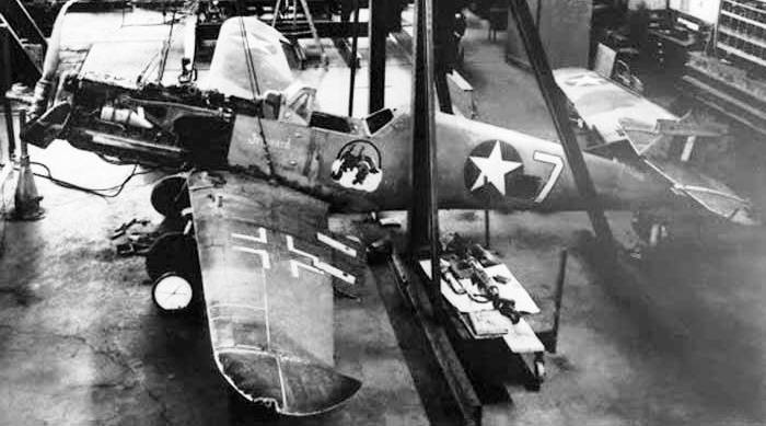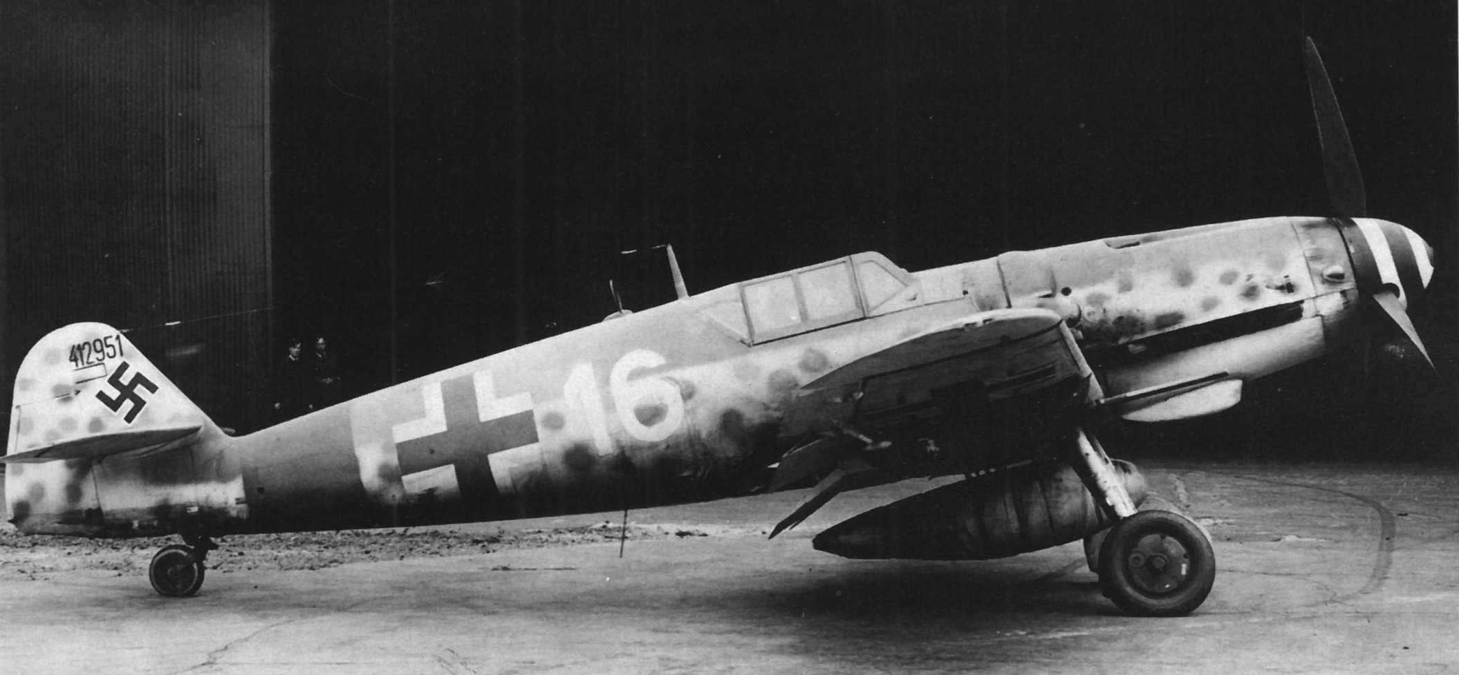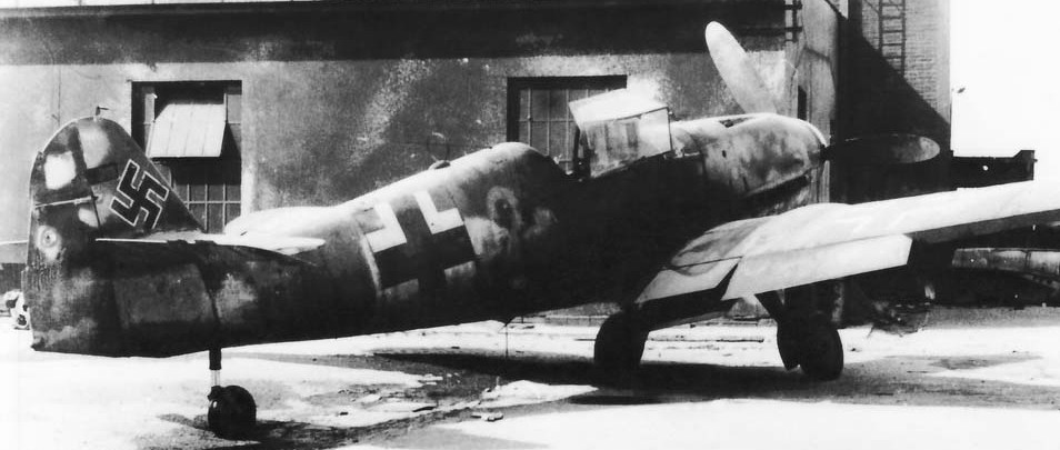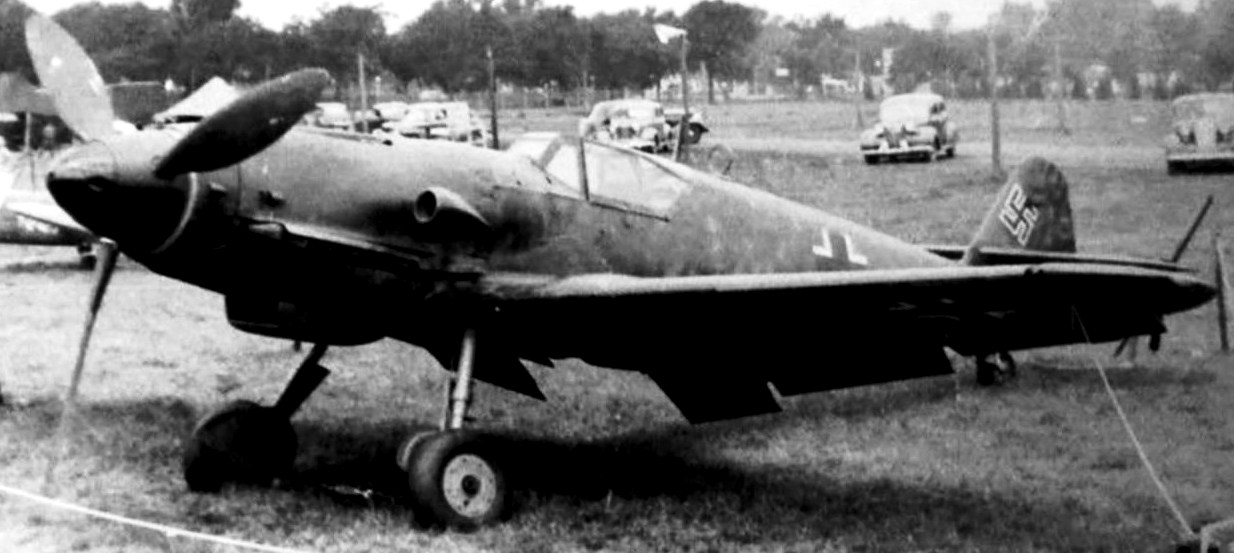 Bf 109G-10/U-4, (Wk. Nr. 610824), 11/JG52, coded “Black 2“, surrendered at Neubiberg, near Munich in the group’s en masse retreat to escape Soviet forces. This machine was one of three Bf 109s taken to the US by Capt Fred McIntosh, in charge of collecting piston-engined aircraft for “Watson’s Whizzers.” After test flying, it was found not to be airworthy and made its journey to Cherbourg by truck, it was then loaded on the aircraft carrier HMS Reaper along with many other captured Luftwaffe aircraft and left port on 19 July 1945. 12 days later it arrived at pier 14 in New York Harbor, and it was then trucked to Newark, New Jersey and finally arrived at Freeman Field near Seymour, Indiana on 17 May 1946. The aircraft was given a rather spurious paint scheme and coded USA FE-124, this was changed later to T2-124, when the Air Technical Service Command underwent re-organization and the Technical Data Laboratory Branch became part of T-2 Intelligence. 610824 was not used for research, but instead became a display aircraft in the early post war era touring various airbases. In 1947, T2-124 and T2-118 were donated to the Georgia Institute of Technology in Atlanta. Sometime around 1955, Bud Weaver, an FAA inspector in Atlanta traded a working aero engine for the two aircraft. They were then stored out in the open at various rental properties owned by Mr. Weaver and soon became derelict due to vandals and exposure to the elements. It was at this time that 610824 lost its original wings. Someone had the local Trash Company haul it off to the dump. Mr. Weaver arrived in time to retrieve the fuselage, but it was too late to save the wings. If anything good could have happened from all this, then at least the weather had worn off the spurious paint job to reveal the original markings on what was left of the airframe. In the mid-1960s T2-124 and T2-118 parted company as John W. Caler of Sun Valley, California Valley purchased the remains of the Me-109. His intentions were to restore the aircraft (in his own garage!) and he was able to obtain a set of wings from a Czech Avia. He reportedly tried to re-skin the fuselage and because of a lack of proper tools and expertise, the results were not a professional looking job. This is supposed to be a clue to 610824’s identity. This project was eventually abandoned and the airframe sold to an unknown private collector, date unknown at this time. Reg. No. N109MS.