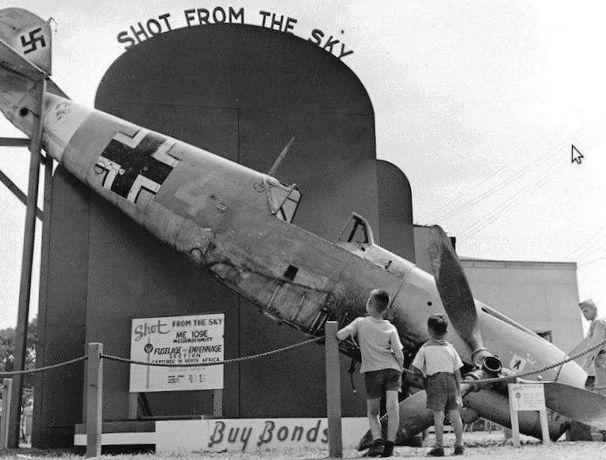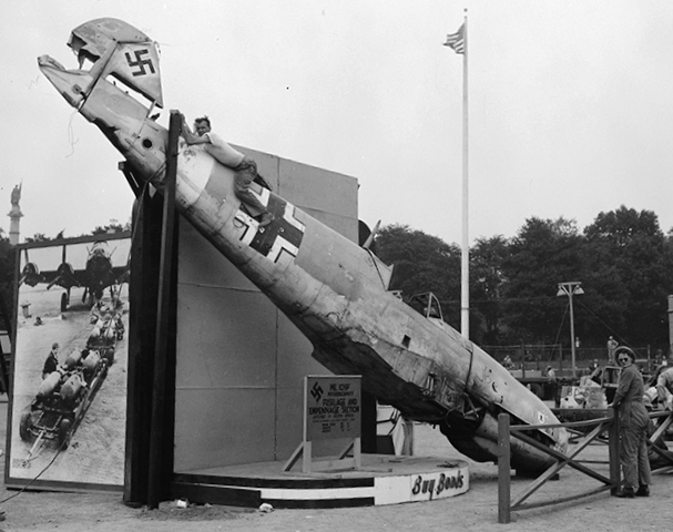 In July 1944, as part of the War Manpower Commission’s “Shot Out of the Sky” program, the wreckage of a German Messerschmitt Bf 109 fighter plane was displayed on the Common’s Parade Grounds in Boston, Massachusetts, in an effort to encourage war bond sales.