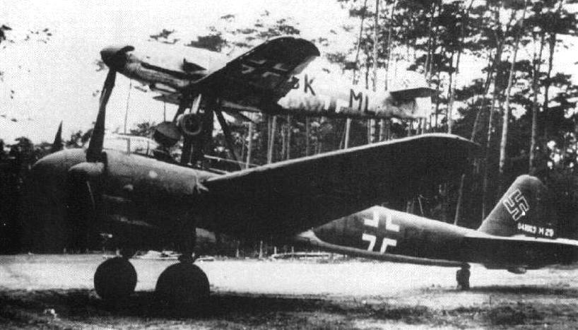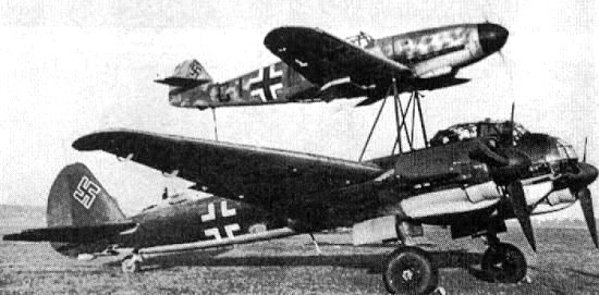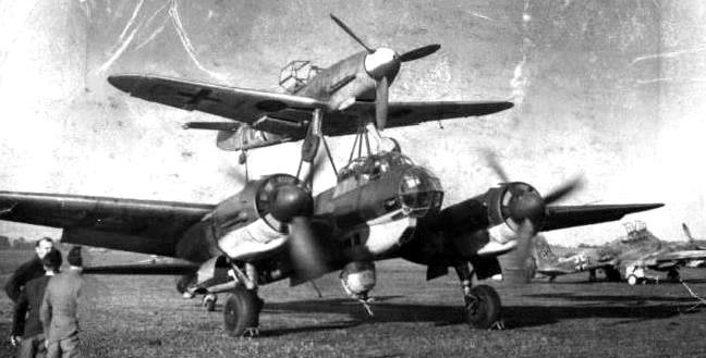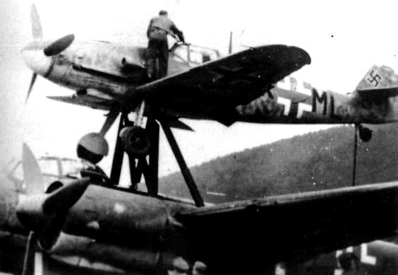 Like the Fw 190, the Bf 109 was mounted on top of a Junkers Ju 88H-1 bomber as part of a Mistel combination. The composite comprised a small piloted control aircraft mounted above a large explosives-carrying drone, the Mistel, and as a whole was referred to as the Huckepack (“Piggyback”), also known as the Beethoven-Gerät (“Beethoven Device”) and Vati und Sohn (“Daddy and Son”). The most successful of these used a modified Junkers Ju 88 bomber as the Mistel, with the entire nose-located crew compartment replaced by a specially designed nose filled with a large load of explosives, formed into a shaped charge. The upper component was a fighter like the Bf 109, joined to the Mistel by struts. The combination would be flown to its target by a pilot in the fighter; then the unmanned bomber was released to hit its target and explode, leaving the fighter free to return to base. The first such composite aircraft flew in July 1943 and was promising enough to begin a programme by Luftwaffe test unit KG 200, code-named “Beethoven”, eventually entering operational service. Other Mistel composites included the Ta 154/Fw 190, Ar 234/Fi 103, Do 217K/DFS 288 and Si 204/Lippisch D-1.