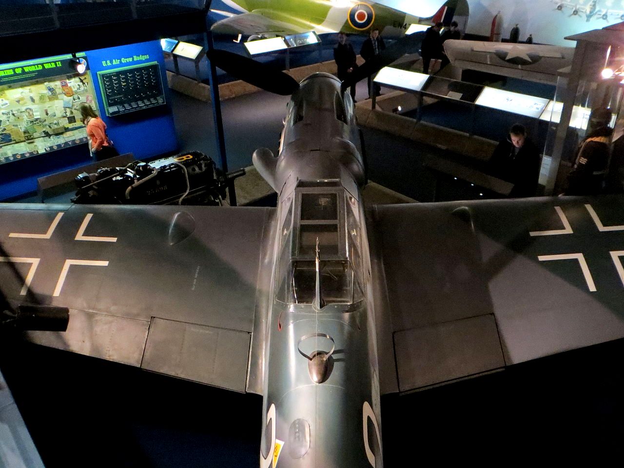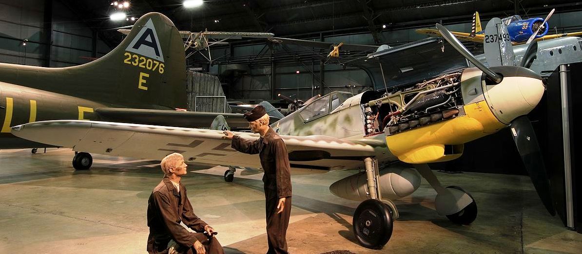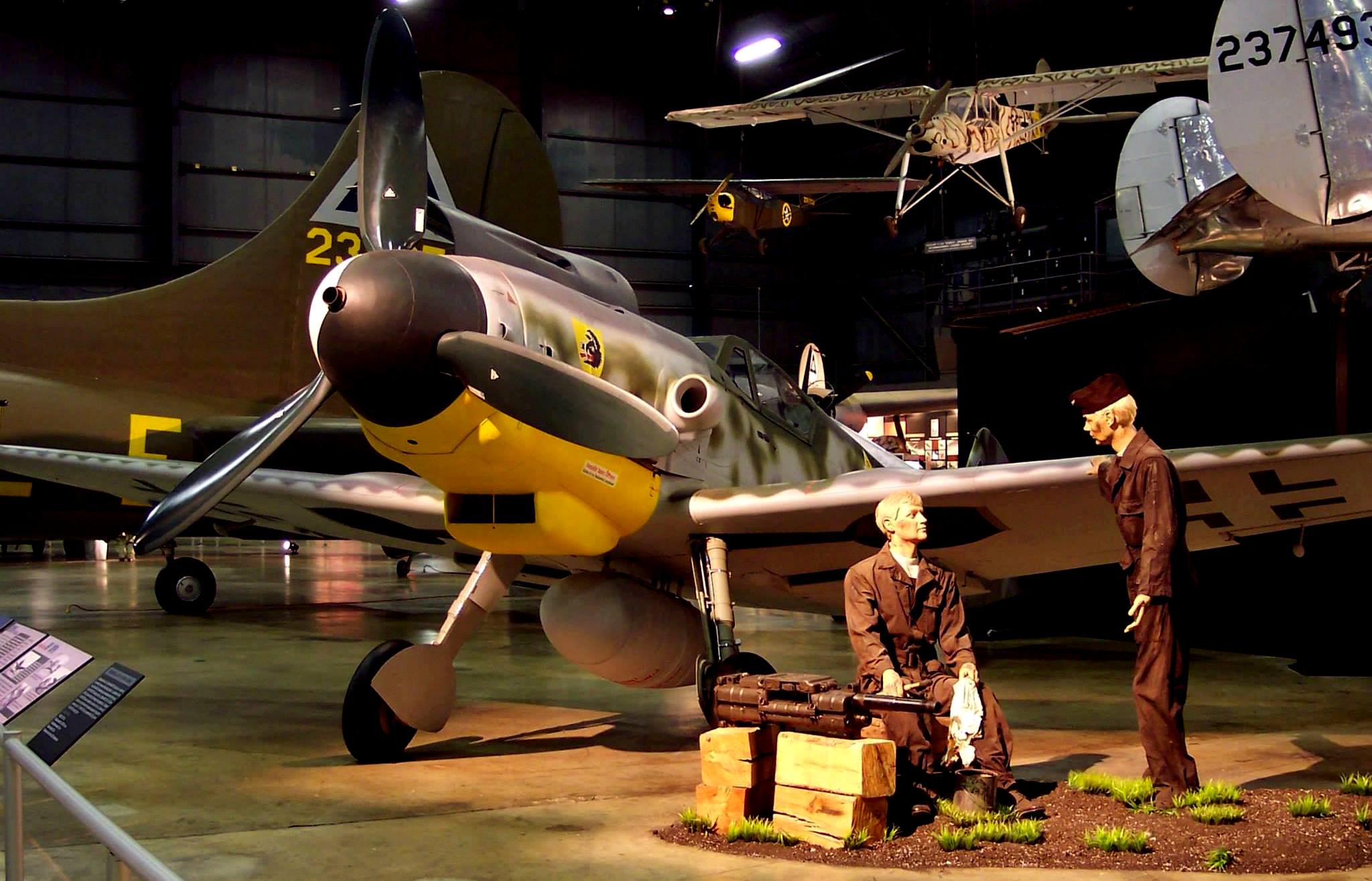 Messerschmitt Bf 109G-10/U4 Gustav (Serial No. 61-0824), C/N 610824, coded “Blue 4“. This aircraft was captured at Neubiberg, near Munich, Germany in May 1945. It was shipped to the USA on HMS Reaper and tested as USA FE-124, later T2-124, at Freeman Field, Indiana. This aircraft is currently preserved in the National Museum of the USAF, Dayton, Ohio. It is painted as (Wk. Nr. 610824), “Blue 4” of JG 300, “Wild Sau.”