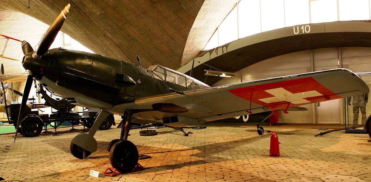 Messerschmitt Bf 109G-2. This aircraft is a Spanish-built Hispano Aviación HA-1109-K1L C.4J rebuilt as a Bf 109G-2 with DB605 engine., on display in the Militärhistorisches Museum der Bundeswehr – Flugplatz Berlin-Gatow (Bundeswehr Museum of Military History – Berlin-Gatow Airfield), Germany.