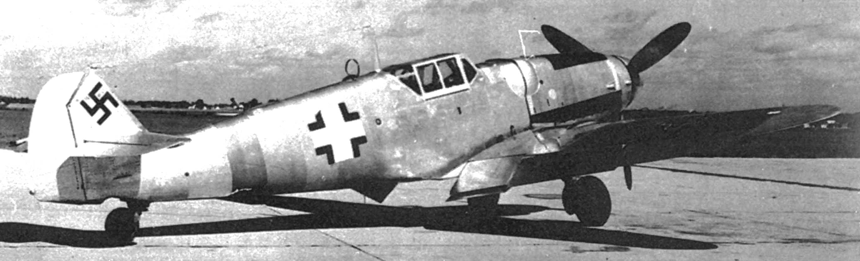 The Messerschmitt Bf 109F was powered by a Daimler-Benz 601E liquid cooled inverted V12 with 1,300-hp. It had a wing span of 32’6½”, a length of 29’½”, and a height of 8’6”. It weighed 4,330 lbs empty and 6,054 lbs with maximum load. It had maximum speed of 390-mph at 22,000’; a maximum rate of climb of 3,320 feet per minute; a range of 440 miles; and a service ceiling of 37,000’. It was armed with one 15-mm MG 151 mounted between cylinder heads and firing through the propeller hub with 200 rpg; and two 7.9-mm MG 17 mounted above the engine with 500 rpg.