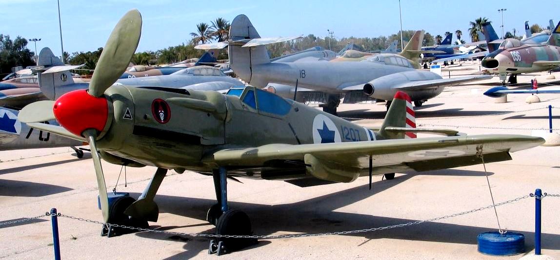 Avia S-199, (Wk. Nr. 782358), D 112, coded 1207 is in the Israeli Air Force Museum, Hazerim Air Force Base, Israel. Israel purchased 25 Avia S-199s (23 delivered) when, due to being embargoed, it was unable to acquire aircraft from other sources. The Israel Air Force retired its aircraft in early 1949. The Czech-built “Mezec” was flown by Israel against the Egyptian Air Force in 1948.