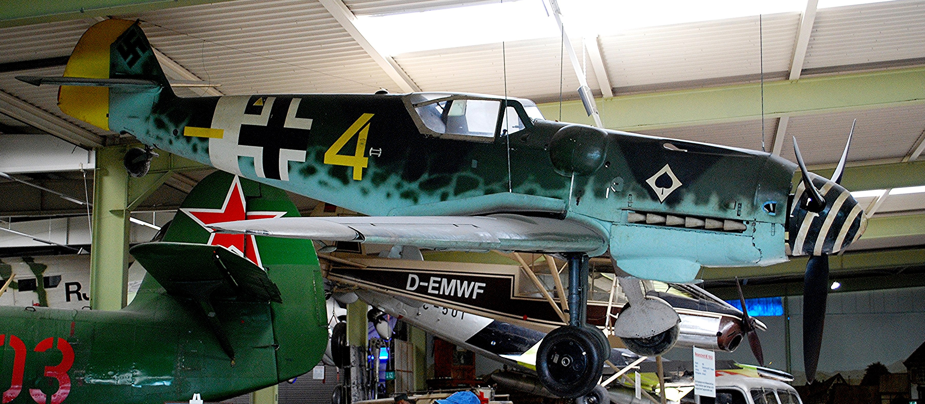 Hispano Aviación HA-1112-M1L C/N 228 coded C.4K-170, Reg. No. N170BG, painted as Messerschmitt Bf 109G-6 (with Erle Haube canopy), “Yellow 4”. This aircraft was used by the Spanish Air Force until 1966, and was later flown in the movies Battle of Britain and Patton. In 1969 it was moved to the Technical University of Aachen, where it was rebuilt into a Bf 109G-6. The institute owned a matching DB 605 engine, which was installed into the airframe. The aircraft was painted as Yellow 4 of Staffel 6, Jagdgruppe II, Jagdgeschwader 53 ‘Pik As’ (‘Ace of Spades’) in a camouflage scheme of RLM74/75/76, as it would have appeared in 1943. The left side remained unrestored and is cut open to show the interior of the aircraft. Yellow 4 has been on display in the Auto und Technik Museum, Sinsheim, Germany, since 1984.