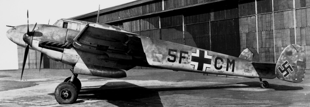 Messerschmitt Bf 110 C-5, (Wk. Nr. 2177), coded 5F+CM, flew with Luftwaffe reconnaissance unit 4(F)/14. It force-landed at Goodwood Racecourse, Sussex, after being hit by gunfire, on 21 July 1940. RAF AX772.
