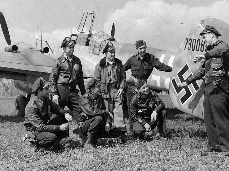 Messerschmitt Bf 110, (Wk. Nr. 730085) being used as the background for a USAAF pilot discussion.