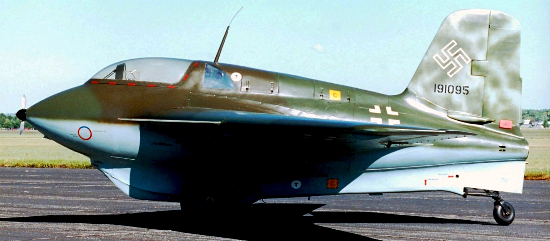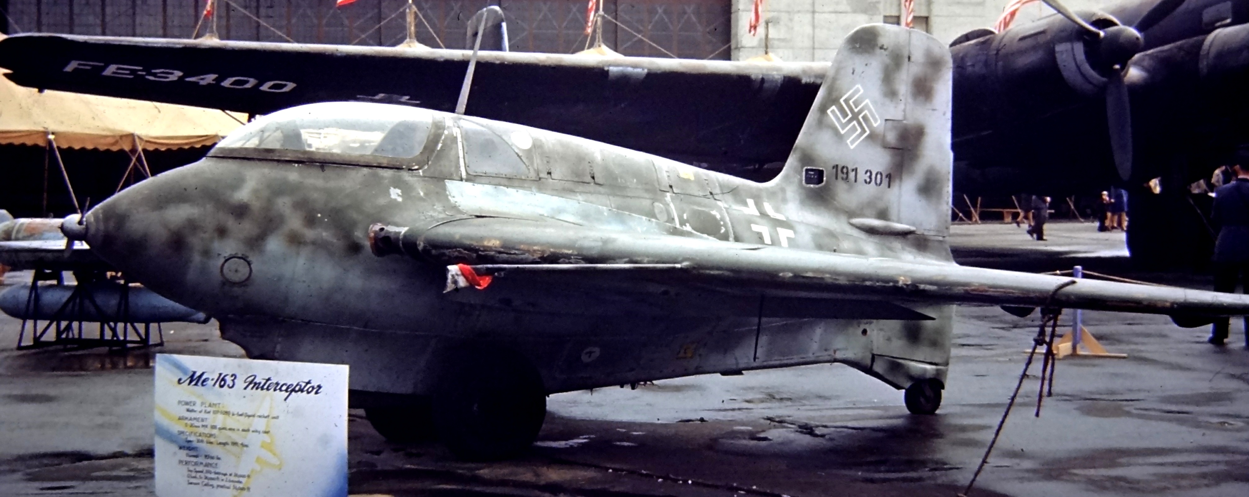 Messerschmitt Me 163B-1a, (Wk. Nr. 191301), brought to Freeman Field, Indiana post war, designated USA FE-495, later T2-495, and then later incorrectly painted FE-500. This aircraft is currently on display in the National Air and Space Museum Steven F. Udvar-Hazy Center, Washington-Dulles International Airport, Chantilly, Virginia.