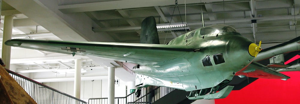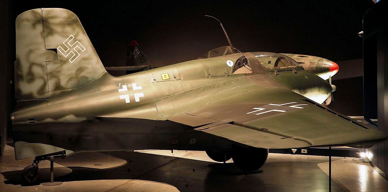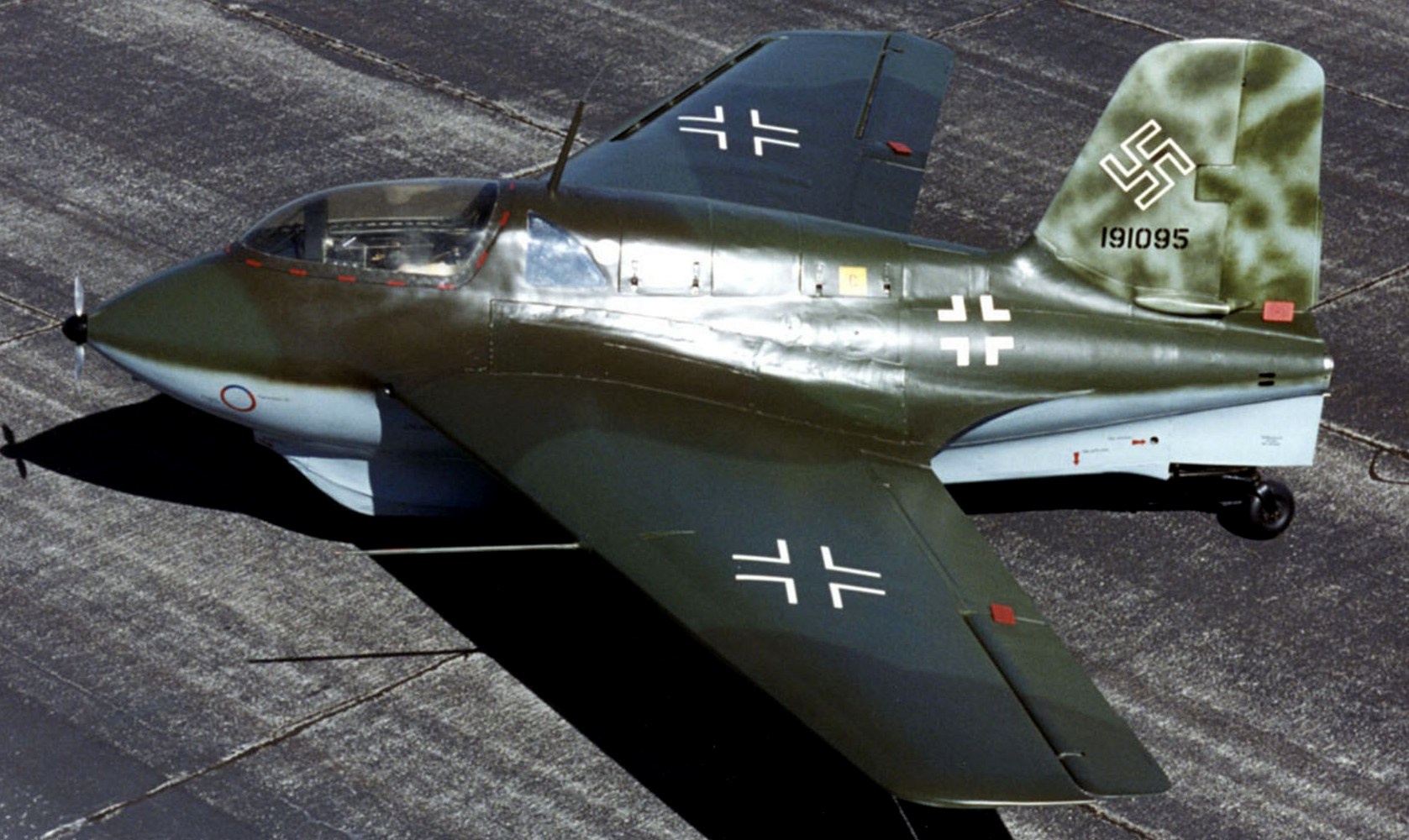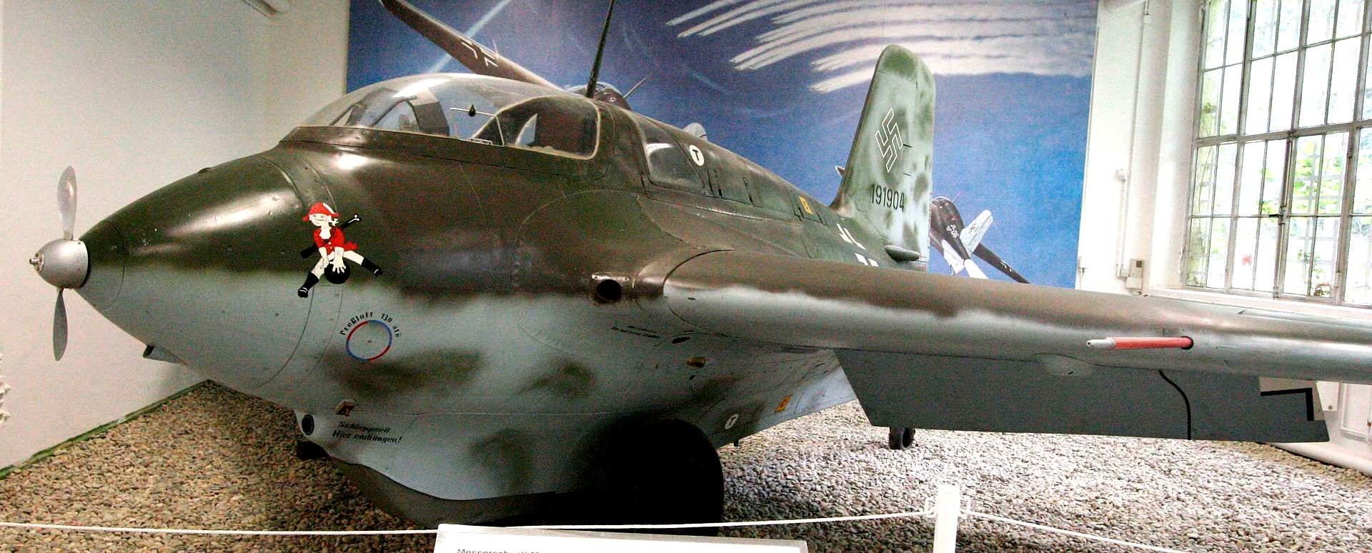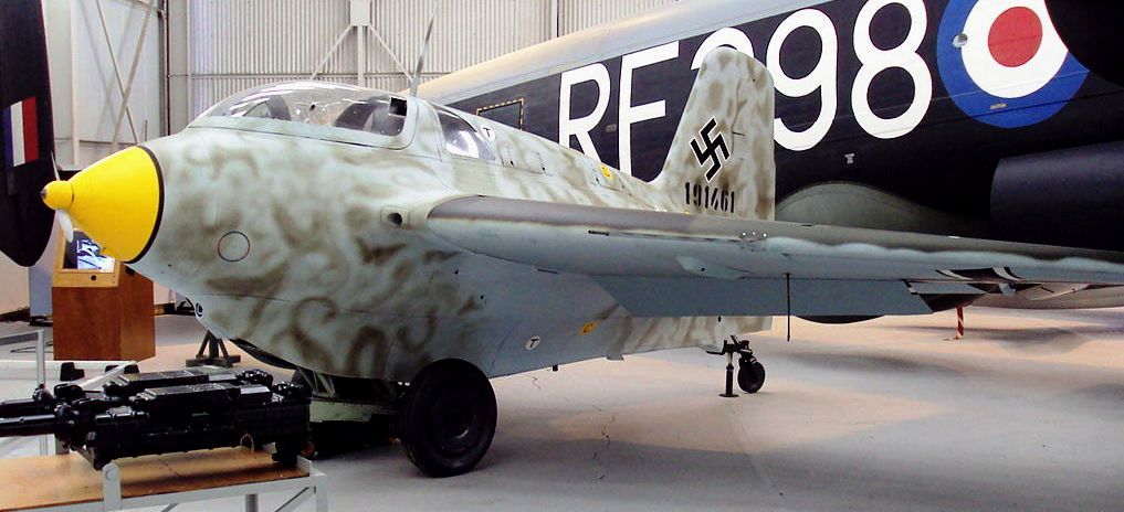 Messerschmitt Me 163B-1a Komet, (Wk. Nr. 191904), “Yellow 25”, belonging to JG 400. This aircraft was captured by the RAF at Husum, Nordfriesland in Schleswig-Holstein, Germany in 1945. It was sent to England, arriving first at Farnborough, receiving the designation RAF AM219. It is now on display in the Militärhistorisches Museum der Bundeswehr – Flugplatz Berlin-Gatow (Bundeswehr Museum of Military History – Berlin-Gatow Airfield), Germany.