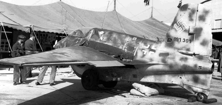 Messerschmitt Me 163B-1a Komet, (Wk. Nr. 191301) before being designated USA FE-500, later T2-500, at Freeman Field, Indiana, post war. This aircraft has survived and is on display in the Steven F. Udvar-Hazy Centre, Chantilly, Virginia.