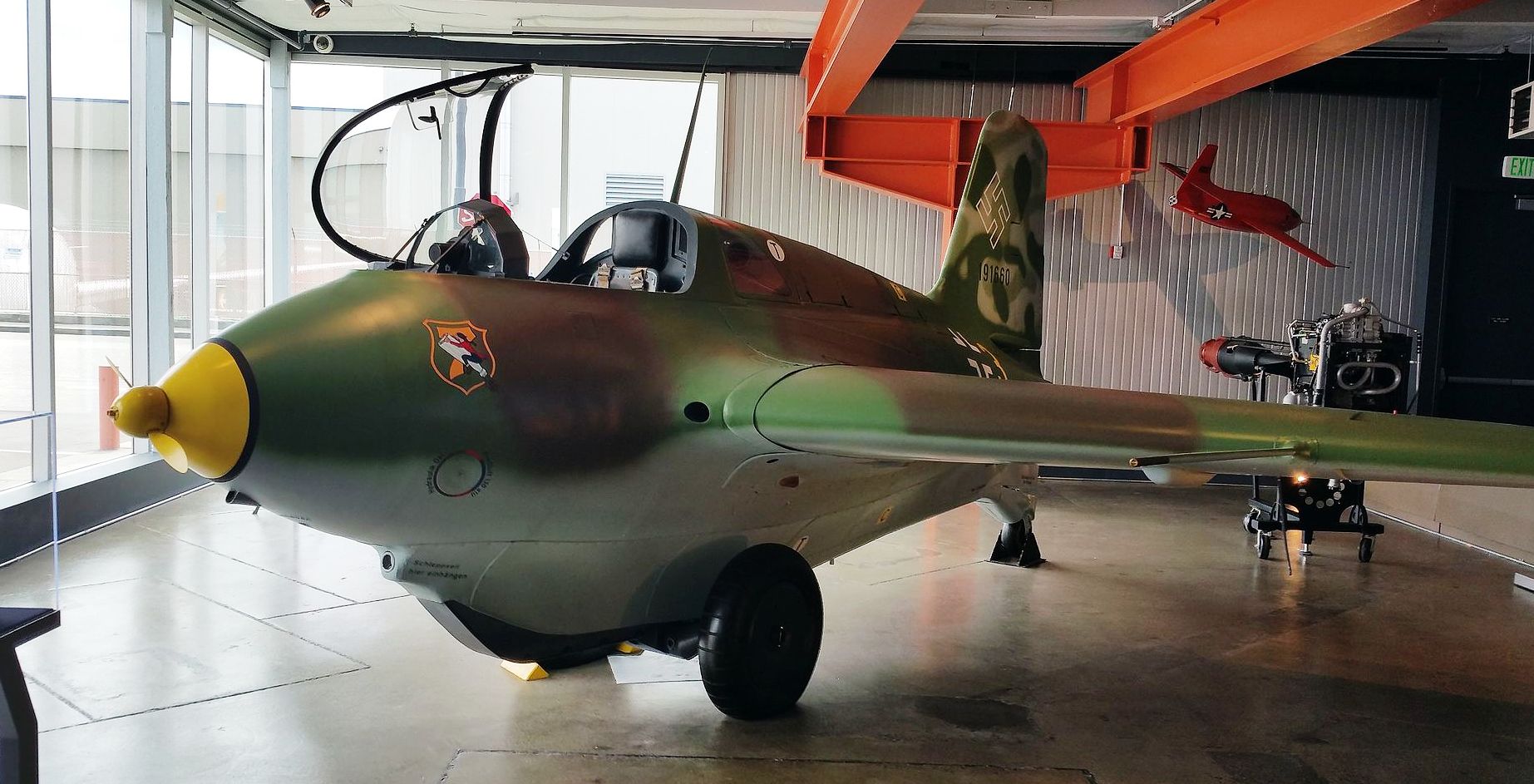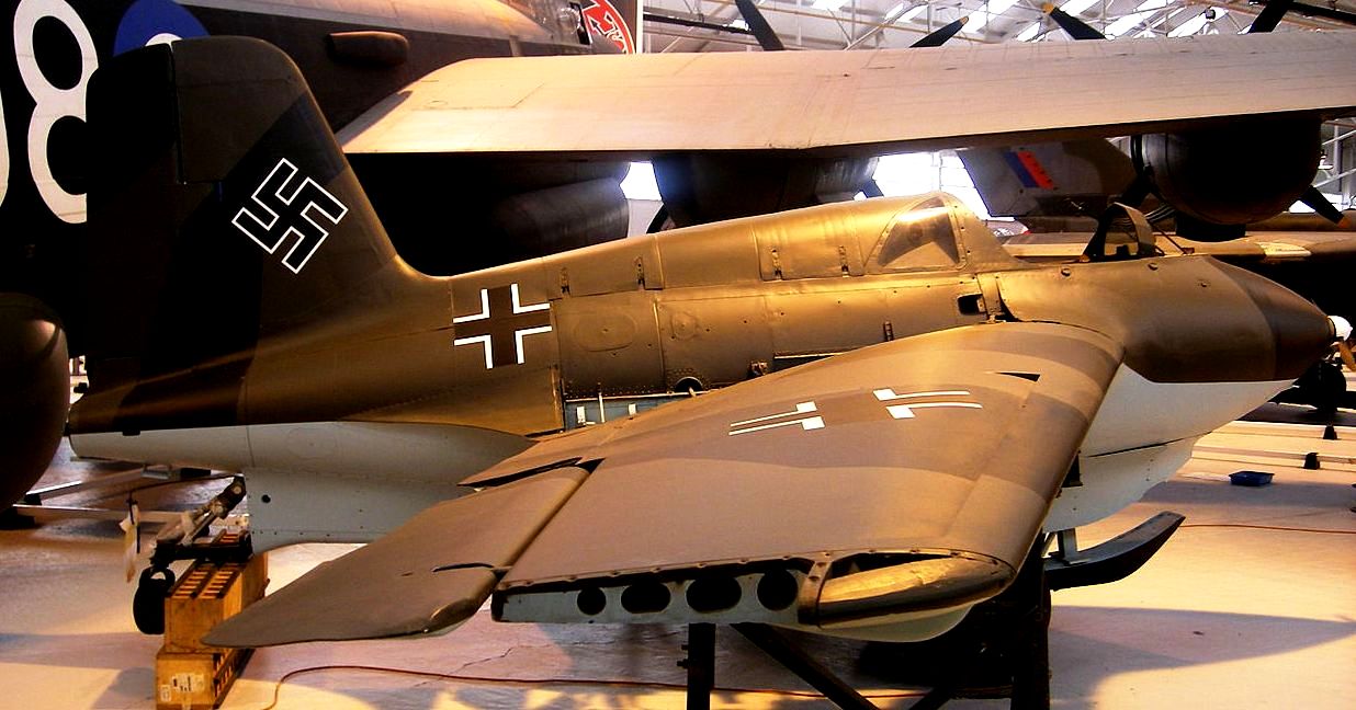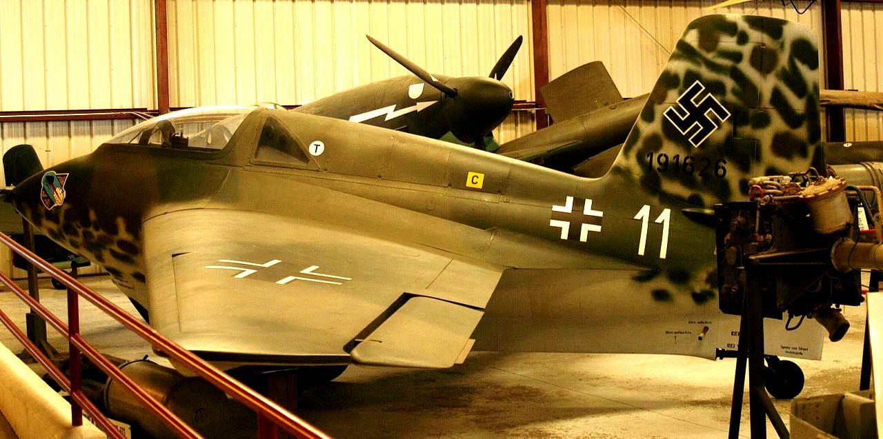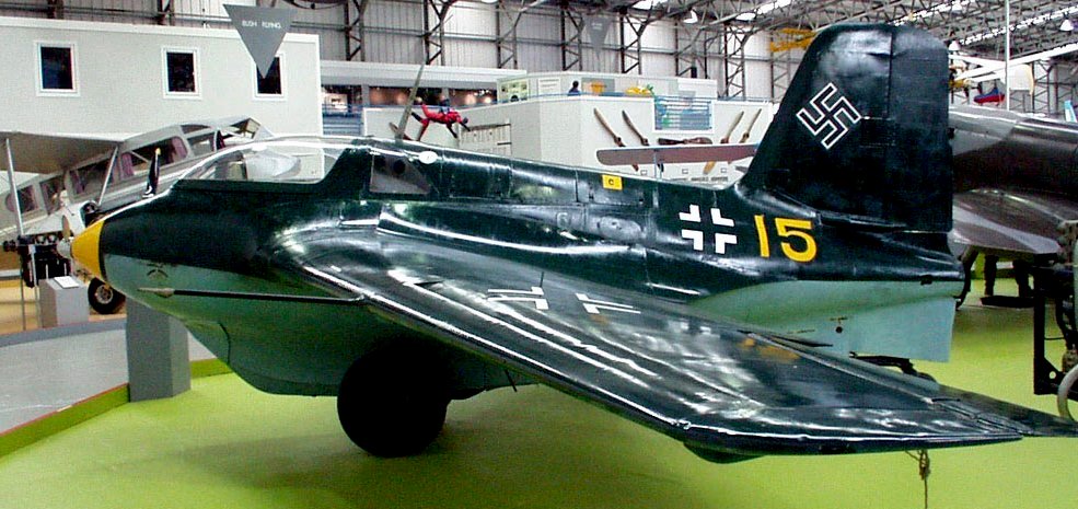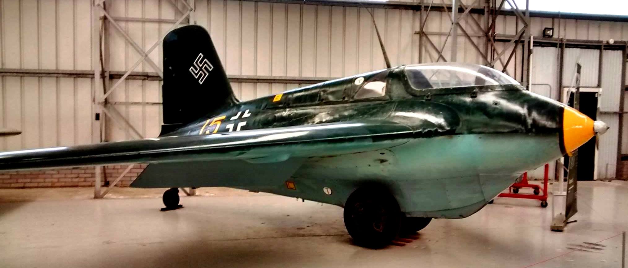 Messerschmitt Me 163B-1a Komet, (Wk. Nr. 191659), “Yellow 15”. Designated RAF AM215, this aircraft is on display in the National Museum of Flight in East Fortune, East Lothian, Scotland. Captured at Husum, Nordfriesland in Schleswig-Holstein, Germany at the end of the war, this Komet went to the College of Aeronautics at Cranfield in 1947. In 1976 it was refurbished and loaned to the Royal Scottish Museum. In 2007 it was donated to the museum by Cranfield University.