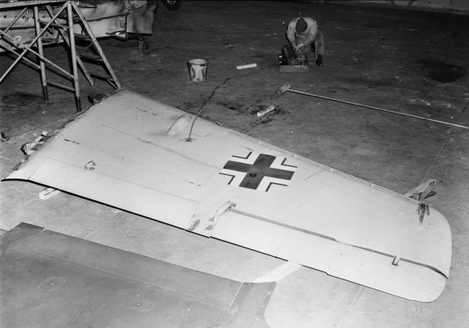 Messerschmitt Me 163B Komet rocket-propelled fighter (Wk Nr. 191095), RAF AM 211, in parts at the Experimental and Proving Establishment, 14 February 1947.