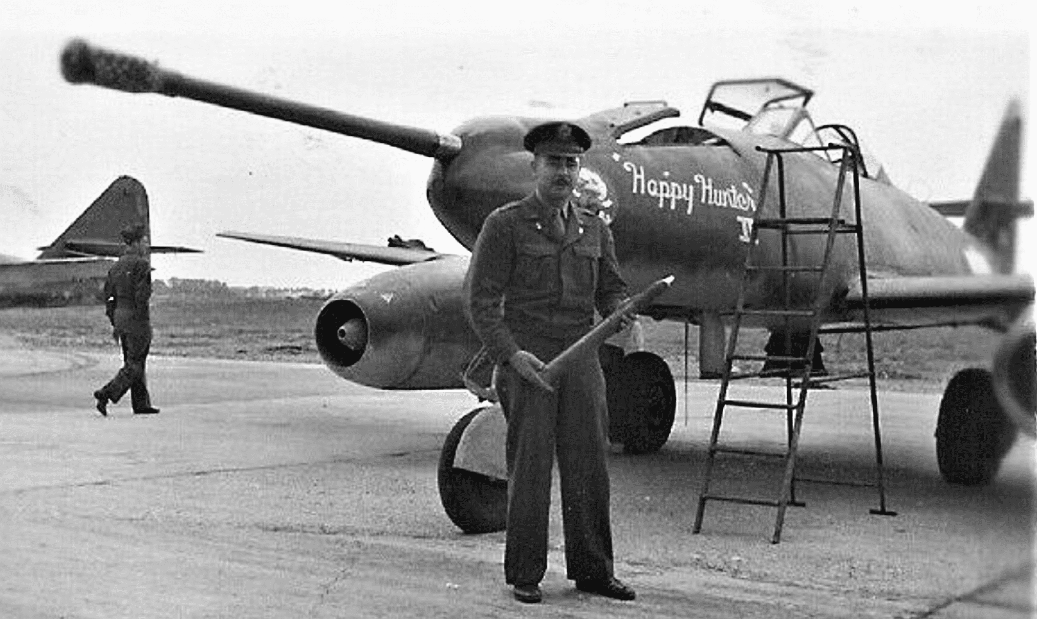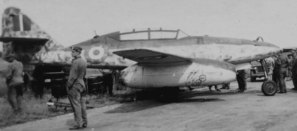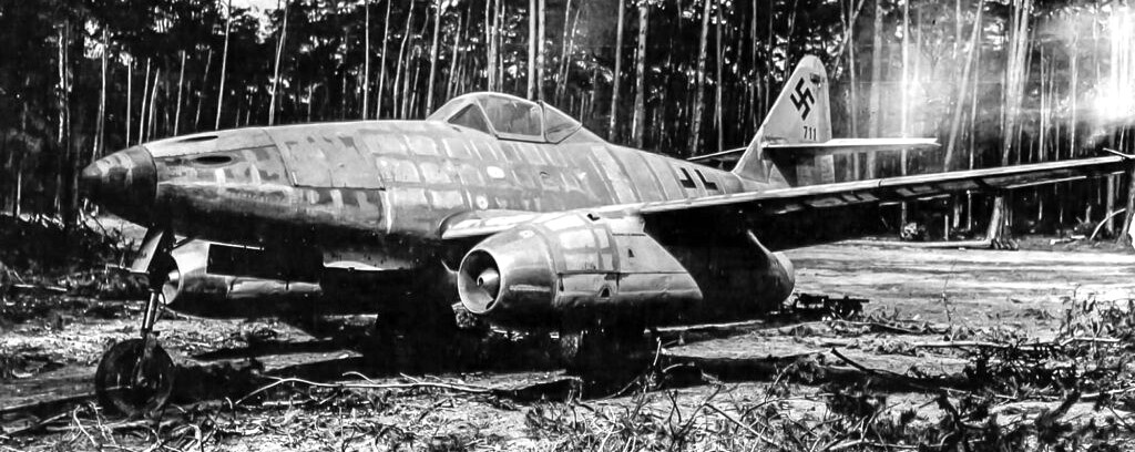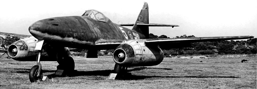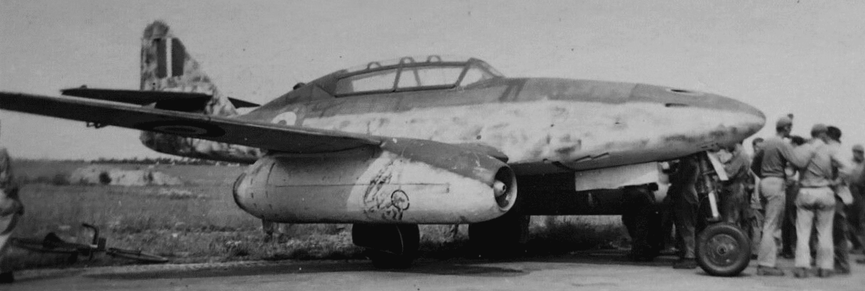 Messerschmitt Me 262A-1a “Schwalbe” (Wk. Nr. 111690), coded “White 5“, 1./JG 7, repainted in RAF markings and designated AM80. It later appeared in a static display during a German Aircraft Exhibition in the UK in 1945. AM80 was packed and shipped to Canada on SS Manchester Shipper on 23 August 1946, arriving in Montréal on 1 September 1946.