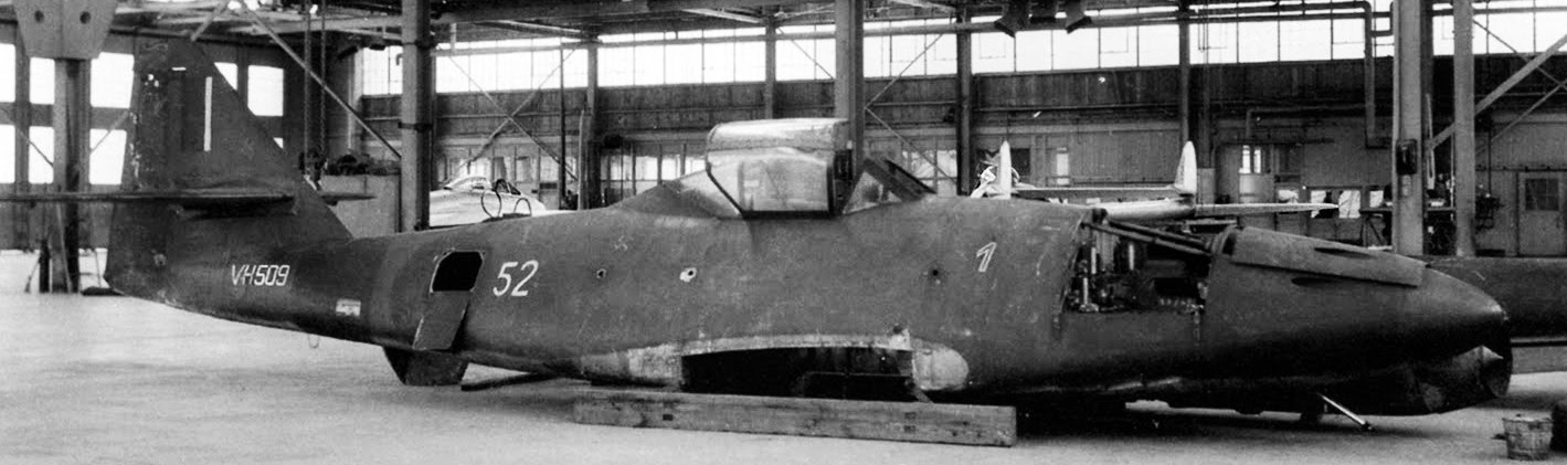 Messerschmitt Me 262A-2a “Sturmvogel” (Wk. Nr. 500210), coded “Red 1“, painted “Yellow 17”, 1./JG 7, surrendered at Fassberg, near Celle, Germany, and taken over by No. 616 Squadron, RAF. Designated AM52, it was flown to Lübeck on 29 May 1945, then ferried to Schleswig-Jagel, and then on to Farnborough on 9 June 1945. It was allocated RAF Serial No. VH509 on 14 June, and made at least one test flight in July at Brize Norton. AM 52 was shipped to Canada from Ellesmere Port on board the SS Manchester Shipper on 23 August 1946, arriving at Montréal on 1 September. AM 52 was sold to Cameron Logan of New Scotland, Ontario, about 1947, with 300 other war-surplus RCAF aircraft, and was eventually scrapped by him at New Scotland.