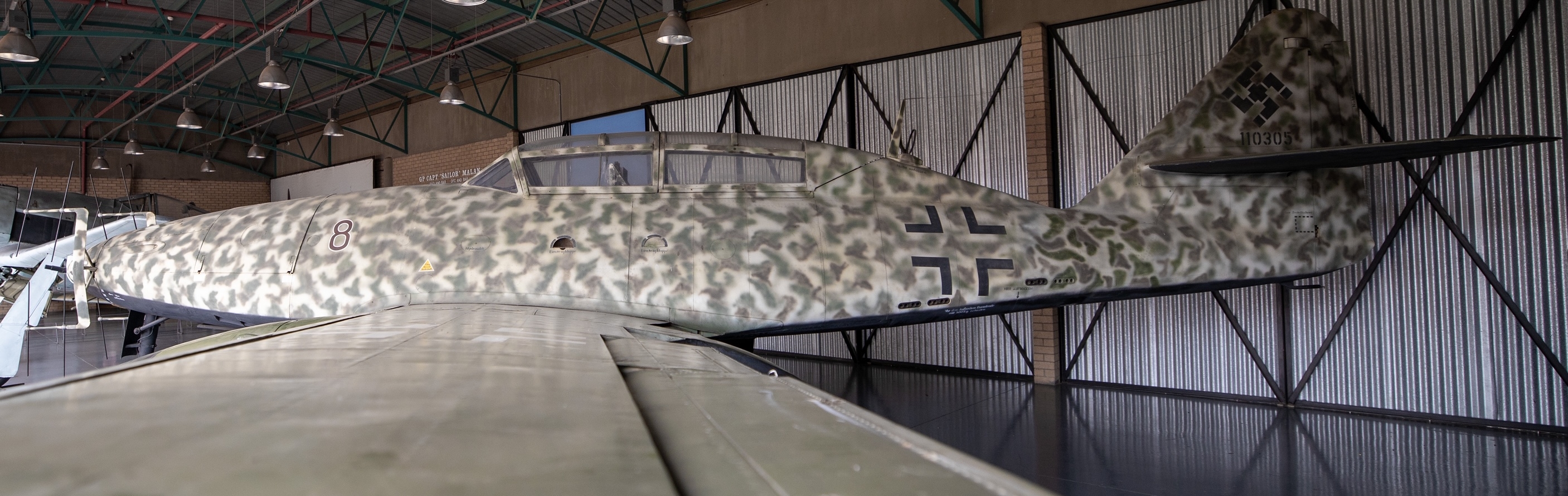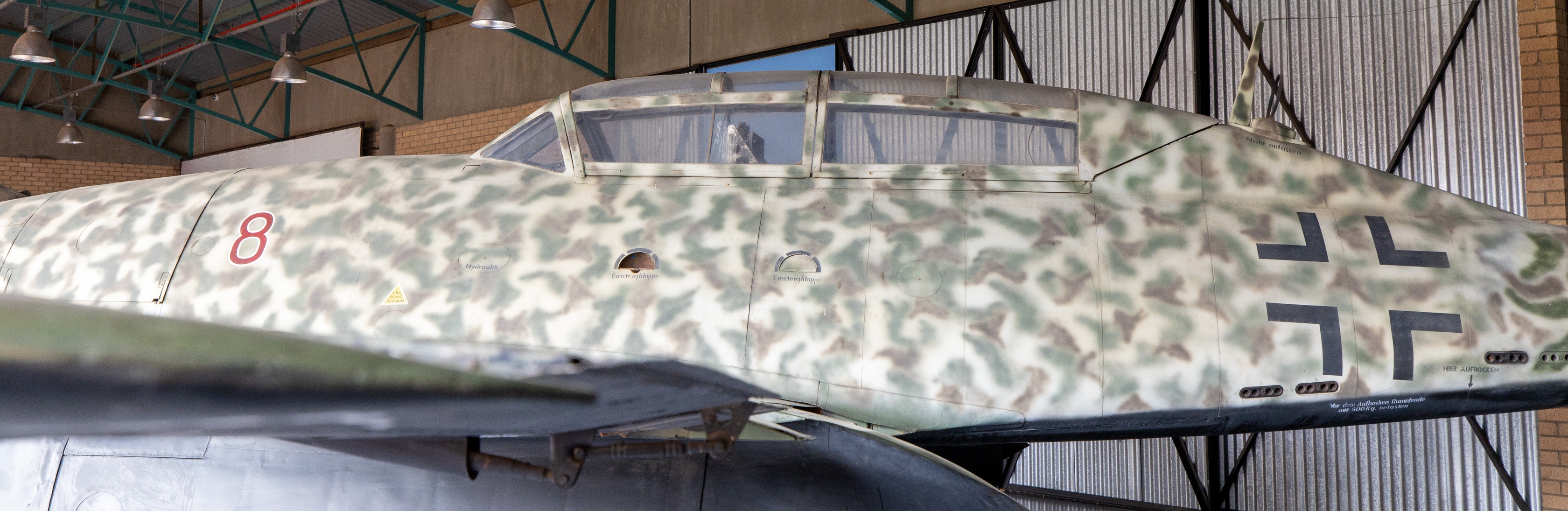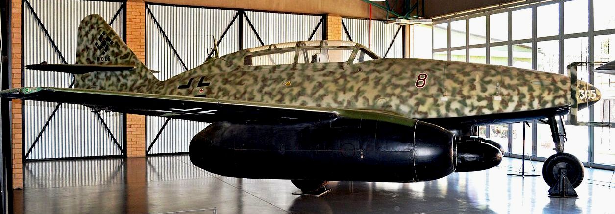 Messerschmitt Me 262B-1a/U1 (Wk. Nr. 110305), “Red 8“, 10./NJG11, 305, two-seat trainer converted into a provisional night fighter version equipped with FuG 218 Neptun radar and Hirschgeweih (stag antler) eight-dipole antenna array. It is currently displayed in the Ditsong National Museum of Military History, Saxonwold, Johannesburg, South Africa.