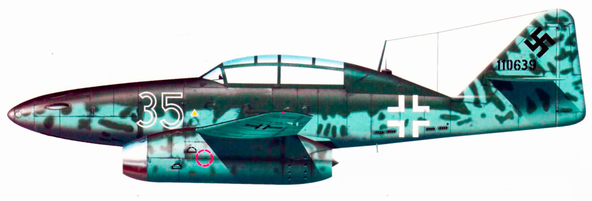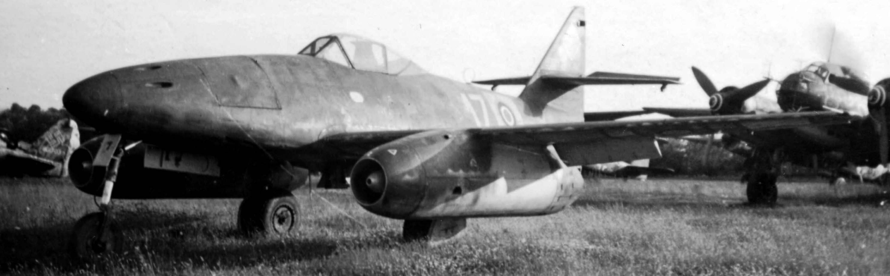 A pair of Me 262s at Schleswig during June 1945. In the background is Me 262B-1a/U1 two-seat night fighter Werknummer 110635, formerly ‘Red 10’ with 10./NJG 11, clearly showing the antennae of its FuG 218 radar.
