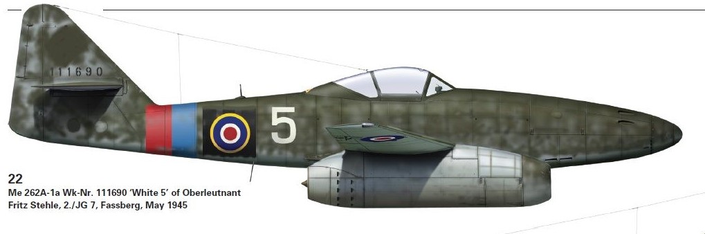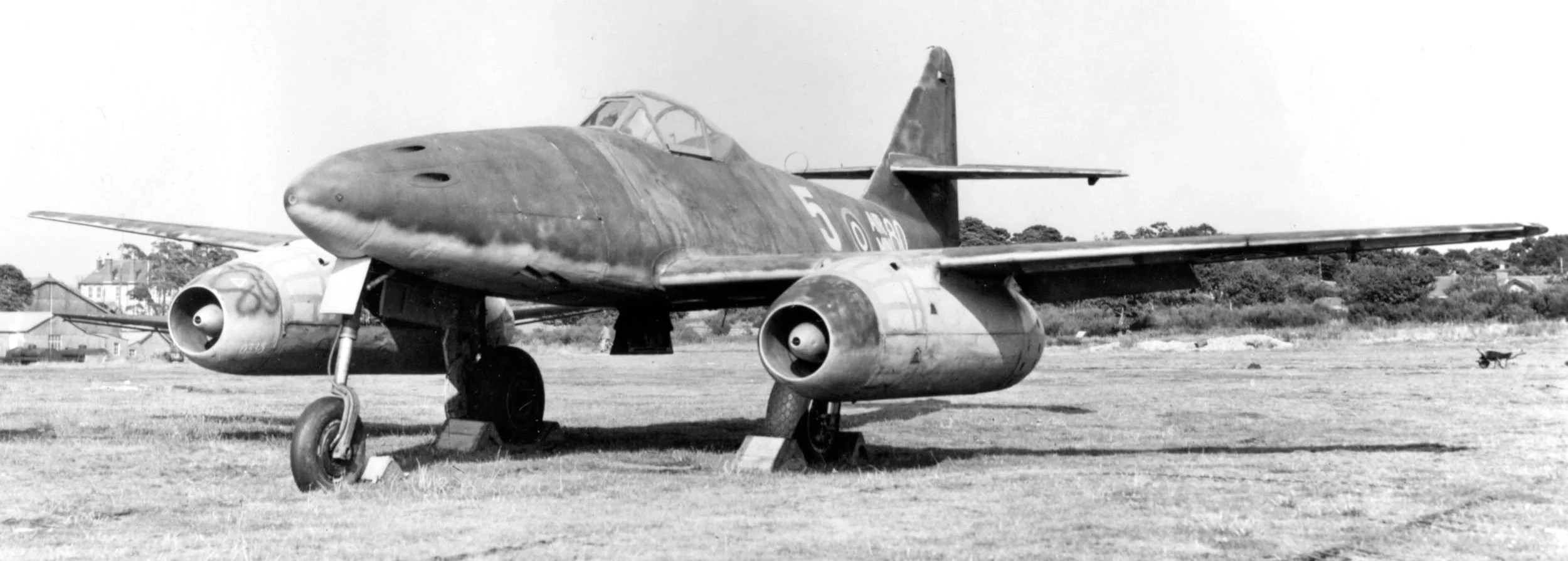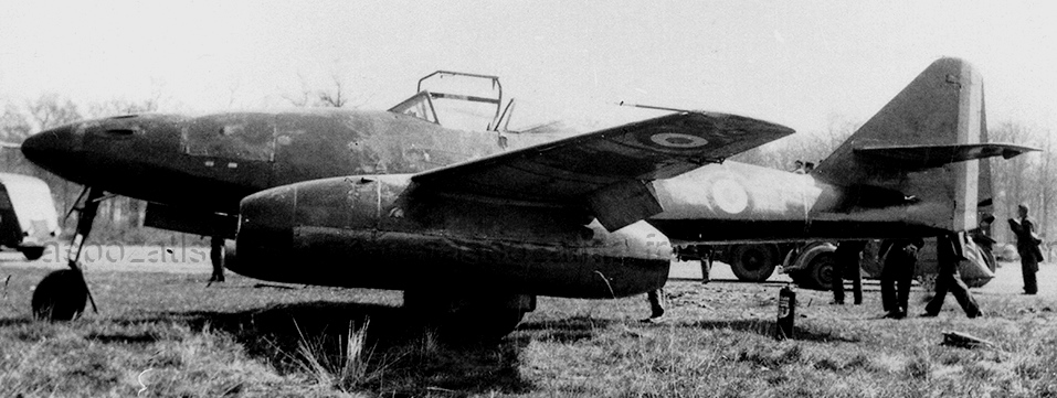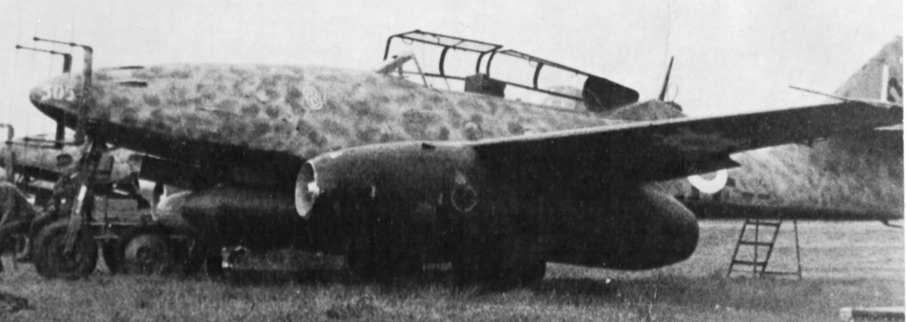 Messerschmitt Me 262A-1a “Schwalbe” (Wk. Nr. 111690), coded “White 5“, 1./JG 7, was built by Messerschmitt at Schwabisch Hall. It had been flown by Fritz Stehle, who was responsible for the last kill of the war, after arriving there from Melsbroek on 5 August 1945. It was surrendered at Fassberg and was transferred to Farnborough via Manston on 6 and 7 August.
