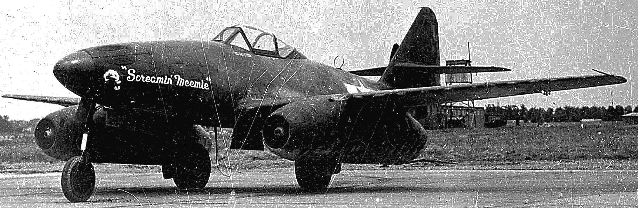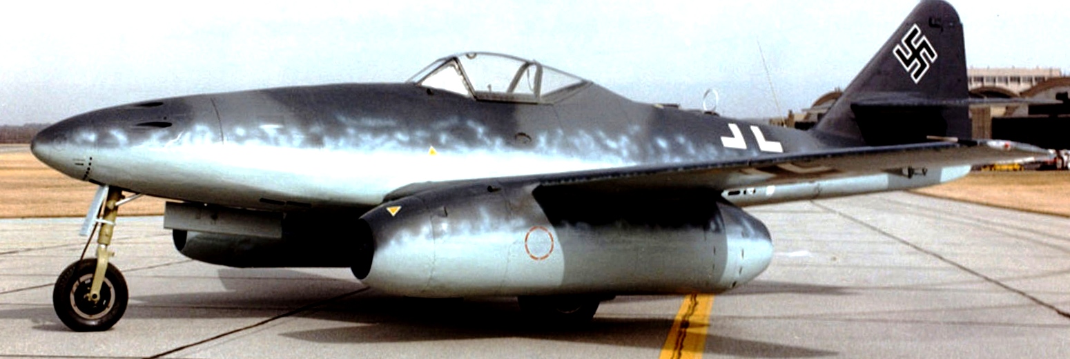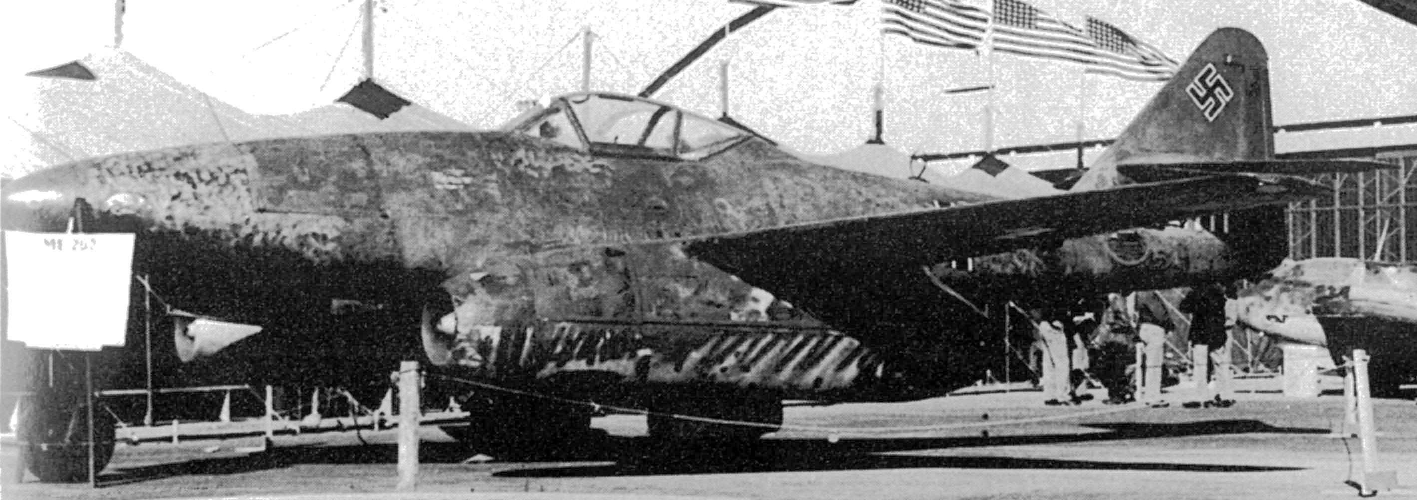 Messerschmitt Me 262A-1a “Schwalbe“ (Wk. Nr. 501232), “Yellow 5“, 3./KG(J)6. This aircraft was designated Watson’s Whizzers No. 111, and was painted as “Beverly Anne“, later “Screamin Meemie“. “Yellow 5” was shipped to the USA on HMS Reaper, with inventory control No. 20. This aircraft was sent to the USN Armament Test Division at NAS Patuxent River, Maryland in Dec 1945 where it was designated USN BuNo. 121442 and test flown. It is now on display in the National Museum of the USAF.