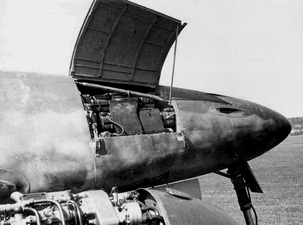 Messerschmitt Me 262A-1a/U3, (Wk. Nr. unknown), White 34, being examined by RAF technicians, 1945. This reconnaissance version was modified in small numbers, with Rb 20/30 cameras mounted in the nose or alternatively one Rb 20/20 and one Rb 75/30. (Rb – Reihenbildner – series-picture, topographic camera). Some retained one 30 mm (1.181 in) MK 108 cannon, but most were unarmed.