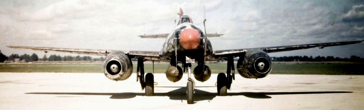 Messerschmitt Me 262A-1a/U4 Schwalbe, (Wk. Nr. 170083), “V083”, “Pulkzerstörer”, armed with one 50-mm Mauser Mk. 214 cannon. USAAF “Feudin 54” A.D Sq was painted on the port side of the nose of all the refurbished Me 262s, later painted over before leaving Lager Lechfeld Flugplatz and being shipped to the USA on HMS Reaper. This aircraft became Watson’s Whizzers No. 000, with the name “Wilma Jeanne” on the starboard side of the nose, later the “Happy Hunter II“. This aircraft crashed on a flight from Lechfield, Germany to Cherbourg.