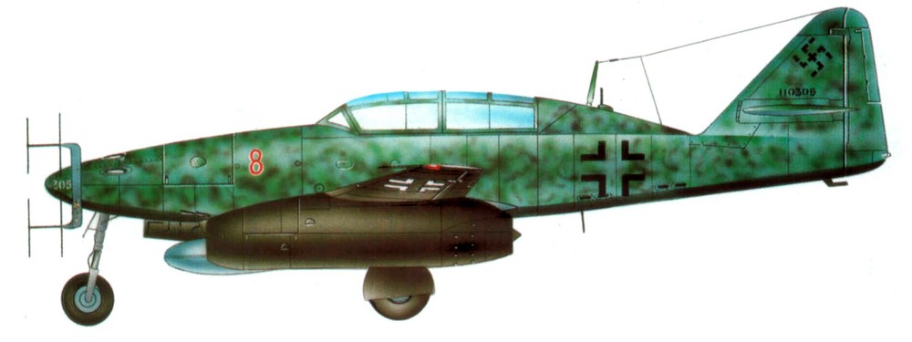 Messerschmitt Me 262B-1a/U1 (Wk. Nr. 110305), “Red 8“, 10./NJG11, 305, two-seat trainer converted into a provisional night fighter version equipped with FuG 218 Neptun radar and Hirschgeweih (stag antler) eight-dipole antenna array. This aircraft was collected at Schleswig-Jagel, Germany in May 1945. “Red 8” flew operationally with Kurt Welters 10./NJG11 at Magdeburg. While at this location it was painted with all-black undersurfaces and mostly black engine nacelles. “‘Red 8” was ferried to the UK on 19 May 1945 by Wg Cdr RJ ‘Roly’ Falk, via Twente, Gilze-Rijen and Melsbroek. It was then flown by Wg Cdr Gonsalvez from the RAE to RNAS Ford, and used for radar and tactical trials from 6 July 1945. Designated AM50, it was later given RAF Serial No. VH519. It was damaged on its first landing at RNAS Ford, but quickly repaired. “Red 8” is the only genuine night fighter version of the Me262 which has survived to the present day. It is currently displayed in the Ditsong National Museum of Military History, Saxonwold, Johannesburg, South Africa.