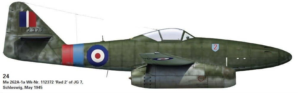 Messerschmitt Me 262A-1a “Schwalbe“ (Wk. Nr. 112372),”Red 2“, 10./NJG11, previously JG7, collected at Schleswig-Jagel, Germany. This aircraft was built in 1945. Designated AM51, it was flown to Farnborough where it was allocated RAF Serial No. VK893 and evaluated by the Royal Aircraft Establishment Aerodynamics Flight. AM51 is currently on display at RAF Hendon, England.