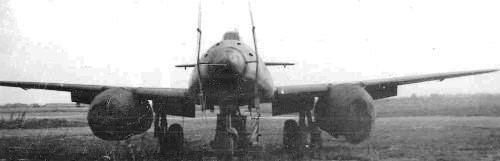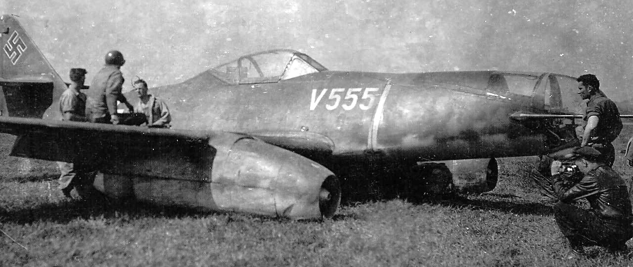 This example of the glazed-nose Me 262 A-2a/U2, second prototype W. Nr. 110555, coded V555was captured at Weimar-Nohra when the war ended. It made 16 test flights, the last of which, on 30 March 1945, ended with an undercarriage collapse.