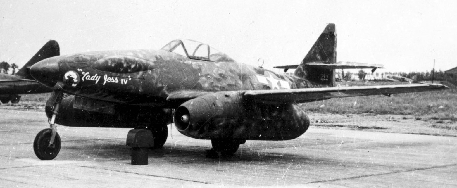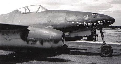 Messerschmitt Me 262A-1a, (Wk. Nr. 113332), No. 2, “Feudin 54th A.D. Sq”, “Julie”, before being transferred to the French Air Force (Armée de l’Air), test flown, crashed on during a test flight, fate unknown. (USAAF Photos)