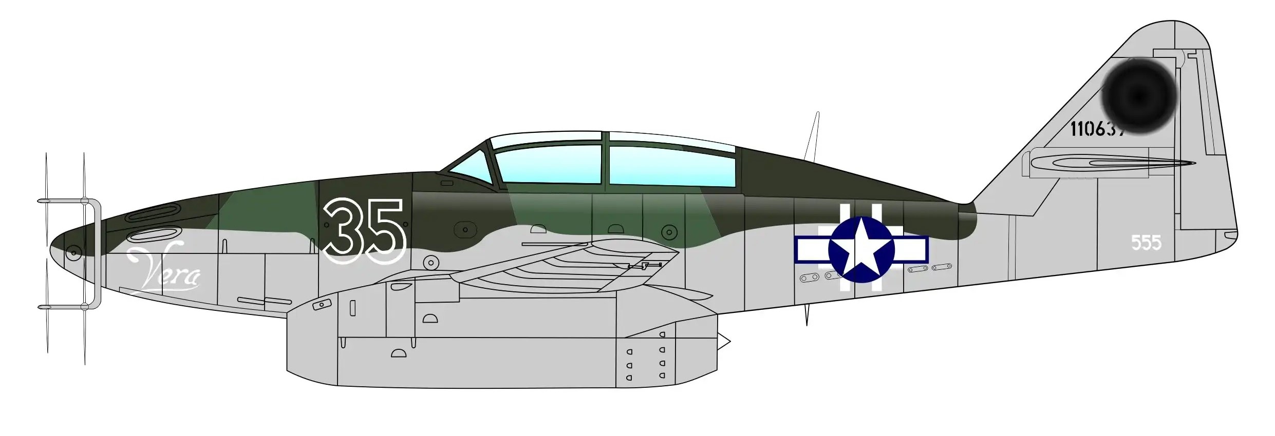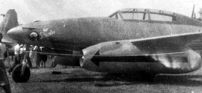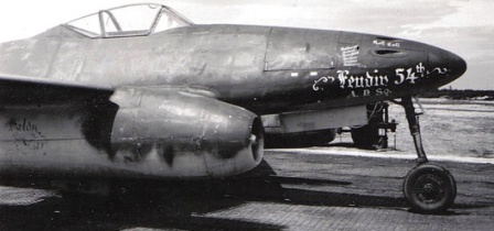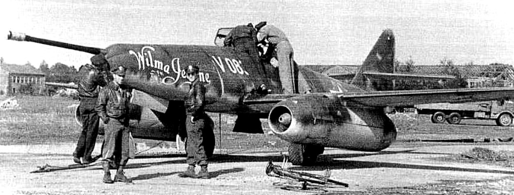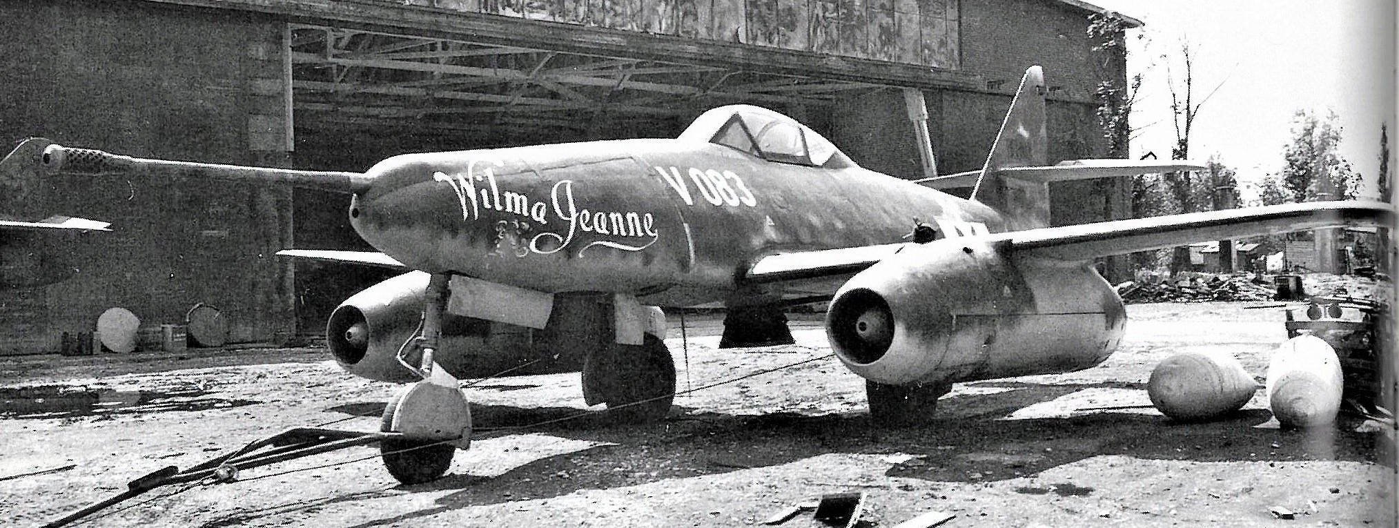 Many of the “Whizzers” named aircraft after family and friends. General Watson named one of the captured Me 262s the “Happy Hunter” after his son. MSgt Freiburger named three of the planes, including “Dennis,” for his son; “Wilma Jeanne,” after his wife; and “Vera,” for a sister-in-law. Me 262A-1a/U4 Schwalbe, (Wk. Nr. 170083) had “Wilma Jeanne” on the port side of the aircraft. All of these refurbished Me 262s had “Feudin 54th A.D. Sq” painted on the starboard side by MSgt Eugene Freiburger. This aircraft crashed at Tilleul-Dame-Agnes, Eure in France on 18 June 1945 (the pilot survived) and therefore never came to the USA.