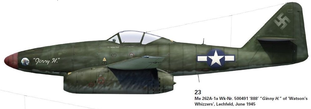 Messerschmitt Me 262A-1b (Wk. Nr. 500491), “Yellow 7“, 11./JG 7, surrendered to Allied forces on 8 May 1945 at Lechfeld. In service with Jagdgeschwader 7, the victory markings found on this aircraft included one P-51, one P-47 and five B-17s. The aircraft has original under wing racks for 24 R4M unguided rockets. Karl Baur test flew this aircraft for some 20 minutes on the 12th of May; well before the arrival of Watson’s team. Watsons Whizzers No. 888, Staff Sergeant Eugene Freiburger of the 54th Air Disarmament Squadron named the plane “Dennis”, after his son. These markings remained on the jet until it arrived in Melun, France, where Lt James (Ken) Holt re-christened it “Ginny H”. named “Dennis“, and then “Ginny H“, it was flown by Lt James K. Holt. “Yellow 7” was shipped to the USA on HMS Reaper, with inventory control No. 29. “Yellow 7” arrived at Wright Field in August 1945, and was subsequently moved to Freeman Field, Indiana, where it remained until May 1946. At Freeman Field it was allocated Foreign Equipment number FE-111, and later T-2-111. As Watson’s Whizzers No. 444 was being prepared for a series of classified flight tests, it’s reconnaissance-modified nose section was exchanged for No. 888’s more streamlined fighter version. This modification took place before the plane was moved to the 803rd Special Depot storage facility at Park Ridge, Illinois in July 1946, when the jet entered long-term storage. In 1950, it was moved again, this time to the National Air Museum facility (now the Garber Facility) at Silver Hill, Maryland. In 1978, the plane was brought out of storage and fully restored, with the modified nose section returned to its original A-1 fighter configuration. “Yellow 7” is now on display in the National Air & Space Museum (NASM), on the Mall in Washington, D.C. (USAAF Photos)