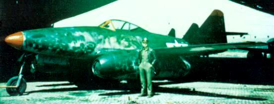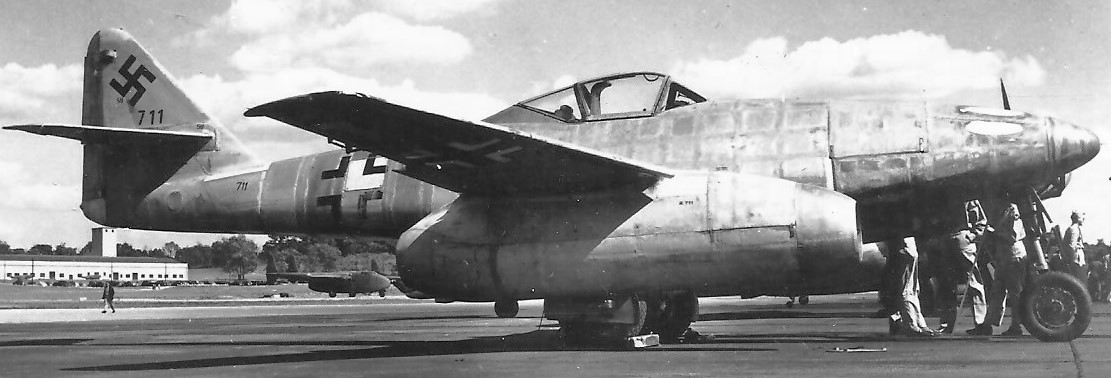 Messerschmitt Me 262A-1a “Schwalbe“ (Wk. Nr. 111711). This new airframe had been surrendered on 31 March 1945 by Messerschmitt test pilot Hans Fay who defected during a functional check flight rather than fly it to an operational unit, landing at Rhein-Main, Frankfurt. It was the first Me 262 to fall into Allied hands. The Me 262 was taken to Thornville, France, and shipped separately to USA on the Manawaska Victory. It was not one of Watson’s Whizzers. The Me 262 was allocated Foreign Equipment number FE-107, and later T2-711. It was test flown by Russell E. Schleeh shortly after its capture. This aircraft was flown by Test Pilot Walter J. McAuley Jr. of the Flight Performance Section, Flight Test Division, Wright Field, Ohio, in a test flight for comparison with a Lockheed P-80. During the flight both engines of the Me 262 caught fire. McAuley, Jr., successfully parachuted to safety, surviving as the aircraft crashed on 20 Aug 1945 ~two miles South of Xenia, Ohio near Route 68.