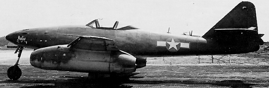 Prior to the arrival of Watson’s team, Master Sergeant Preston of the 54th Air Disarmament Squadron named this plane “Connie …My Sharp Article” (after his wife). “White 5” became Watson’s Whizzers 444, and was ferried to Melun, France by Lt Roy Brown, who renamed it “Pick II” (after a nickname derived from his wife’s maiden name). Brown ferried the jet to the port of Cherbourg, France, where it was loaded onto the British escort carrier HMS Reaper. While on the deck of the HMS Reaper, it was allocated inventory control No. 19. After arrival at Newark, Watson ferried 444 to Freeman Field, Indiana on 19 August, 1945. There, the Army Air Force assigned “White 5” a Foreign Equipment number, FE-4012. This was later changed to T2-4012. This aircraft was selected to participate in classified tests against the Lockheed P-80, and underwent a nose section changeup with Watson’s Whizzers 888, later FE-111. The machine was given an overall reconditioning for the tests.