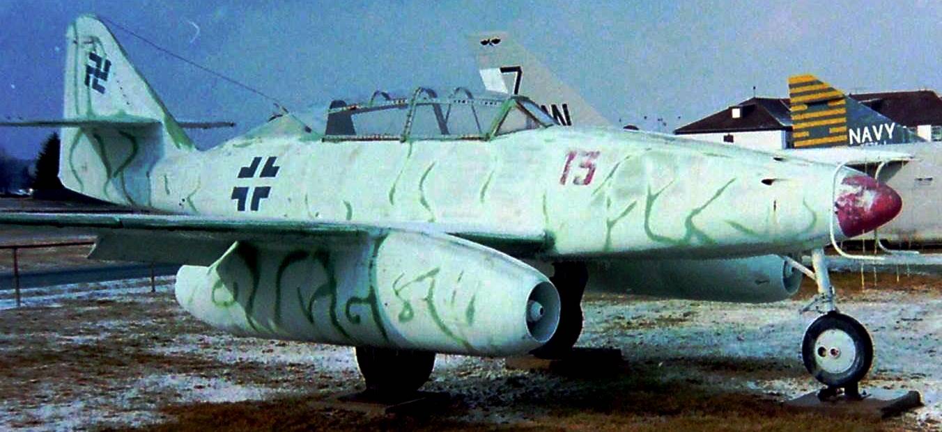 Messerschmitt Me 262A-1a, (Wk. Nr. 500071) coded “White 3“, III/JG7. This aircraft made an emergency landing due to lack of fuel at Dübendorf, Switzerland on 25 April 1945. Flown by Hans Guido Mutke while a pilot of 9. Staffel/JG 7, “White 3” was confiscated by Swiss authorities on 25 April 1945. Although it was taken over by the Swiss, it was not flown by them. After many years of storage at Dübendorf, the aircraft was given to the Deutsches Museum at Munich on 30 August 1957, where it is currently on display.