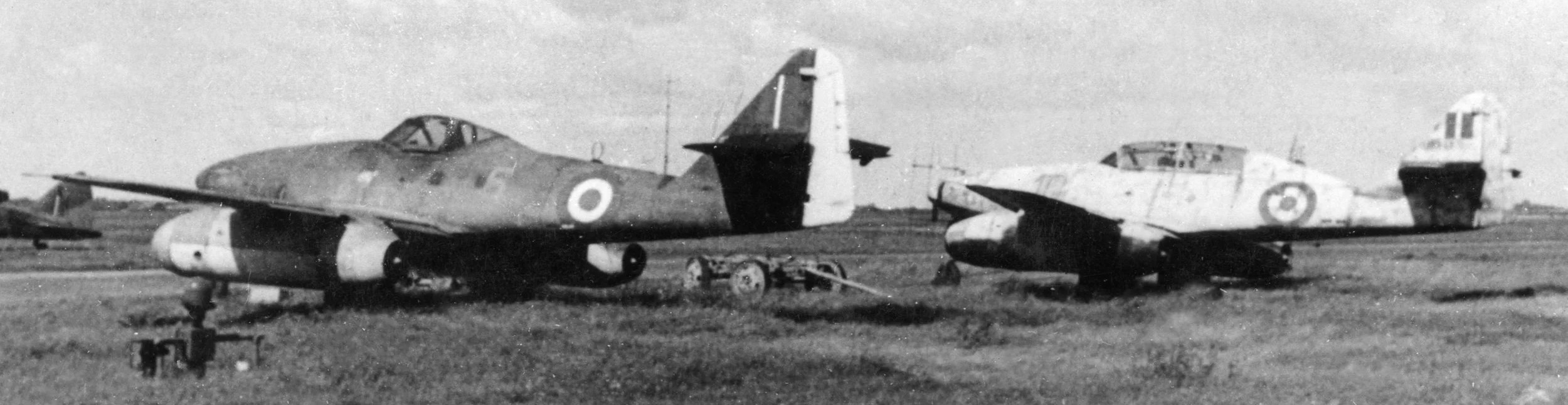 Messerschmitt Me 262A-1a “Schwalbe” (Wk. Nr. 111690), coded “White 5“, 1./JG 7, repainted in RAF markings and designated AM80, shown after its arrival in Canada, at Aylmer, Ontario, alongside an RCAF de Havilland Mosquito.