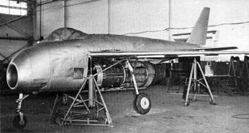 The Me P.1101 V1 was about 80% complete when the Oberammergau complex was discovered by American troops on 29 April 1945, a few days before the war’s end.  The fuselage was constructed out of duralumin, with space providedbeneath the cockpit for the air duct. Located behind the cockpit and above the engine was the fuel supply of 1000 liters (220 gallons).   The rear fuselage tapered down to a cone, where the radio equipment, oxygen equipment, directional control and master compass were mounted.  The underside of the rear fuselage was covered over with sheet steel, for protection from the heat of the jet exhaust.  Although a Jumo 004B jet engine was planned for the first prototype, the more powerful  He S 011 could be added on later versions with a minimum of fuss.  The wing was basically the same as the Messerschmitt Me 262 wing from the engine (rib 7) to the end cap (rib 21), including the Me 262’s aileron and leading edge slats. A second wing assembly was delivered in February 1945, in which the leading edge slots had been enlarged from 13% to 20% of the wing chord. The wing covered in plywood, and could be adjusted on the ground at 35, 40 or 45 degrees of sweepback. Both the vertical and horizontal tails were constructed of wood, and the rudder could be deflected 20 degrees. Also under design was a T-tail unit and a V-tail also. The undercarriage was of a tricycle arrangement. The nose wheel retracted to the rear and was steerable. The main gear retracted to the front, and included brakes. The cockpit was located in the nose, with a bubble canopy giving good vision all around. The canopy was kept clear by warm air which could be drawn from the engine. Cockpit pressurization was to be incorporated in the production model, as was either two or four MK 108 30mm cannon. The production model was also to fitted with cockpit armour, and up to four underwing X-4 air-to-air missiles could be carried.