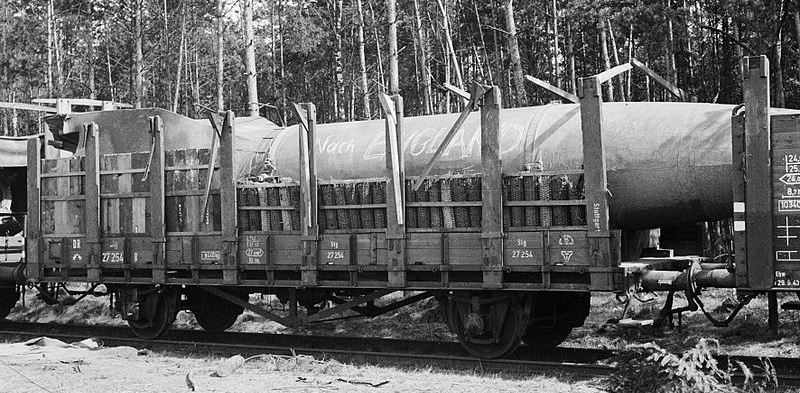 V2 mounted on a railcar at Leese in Germany ready for transporting to the launch site. During their advance into Holland, the British and Canadians uncovered a number of V2 sites.